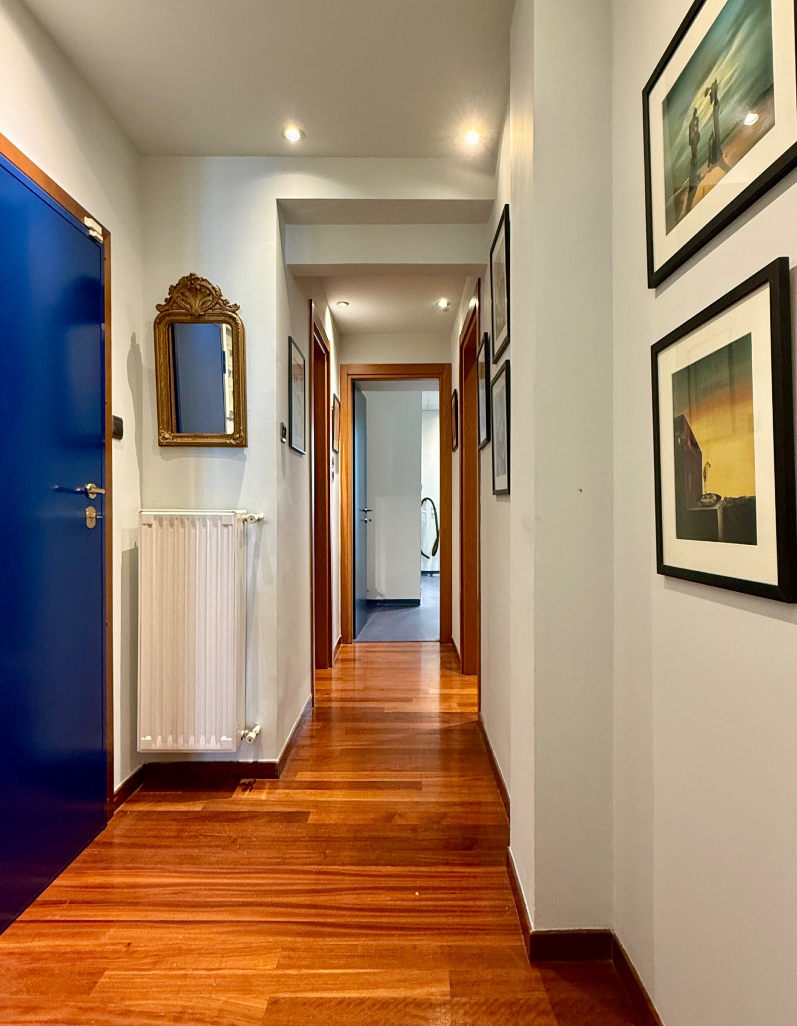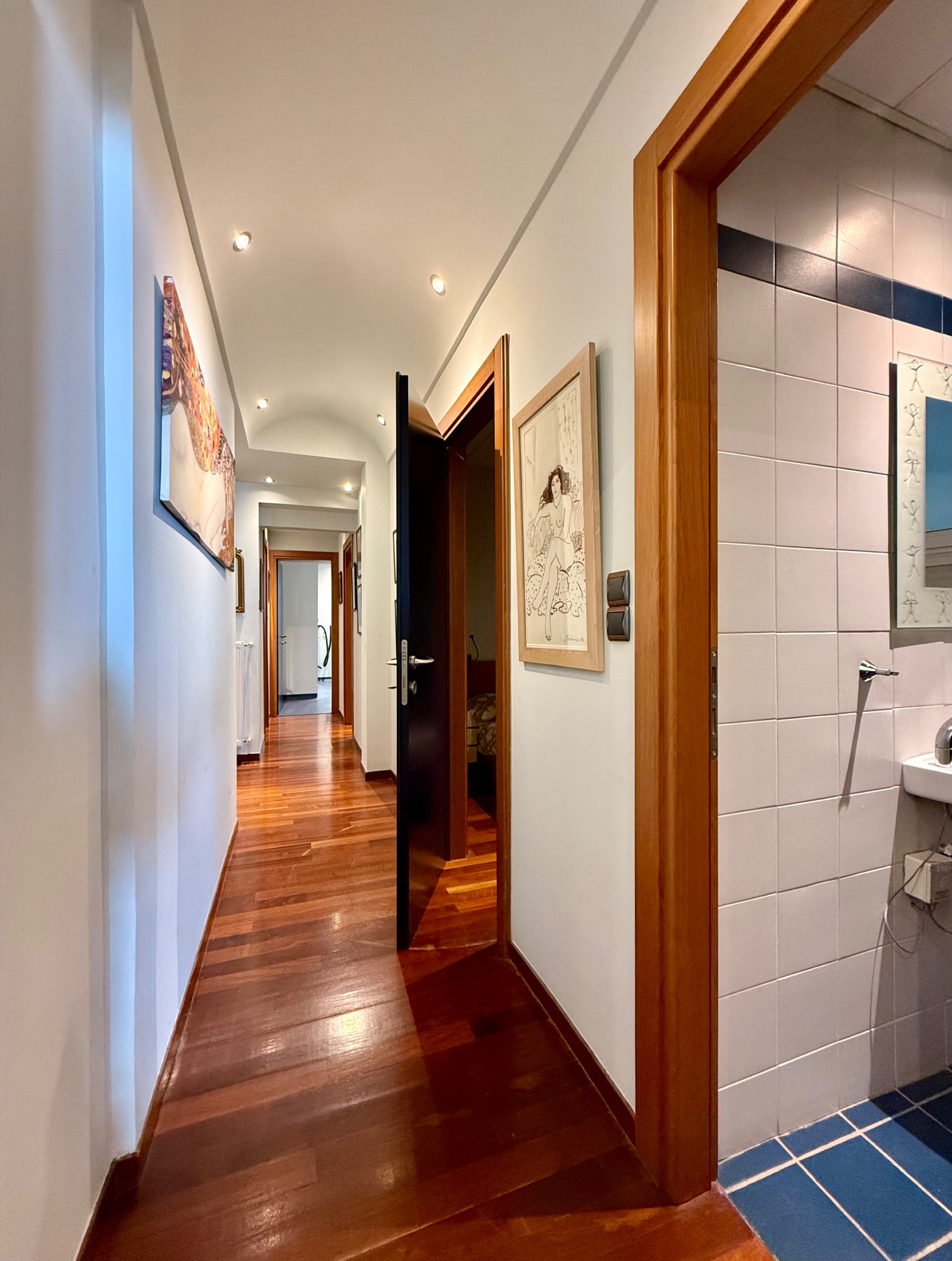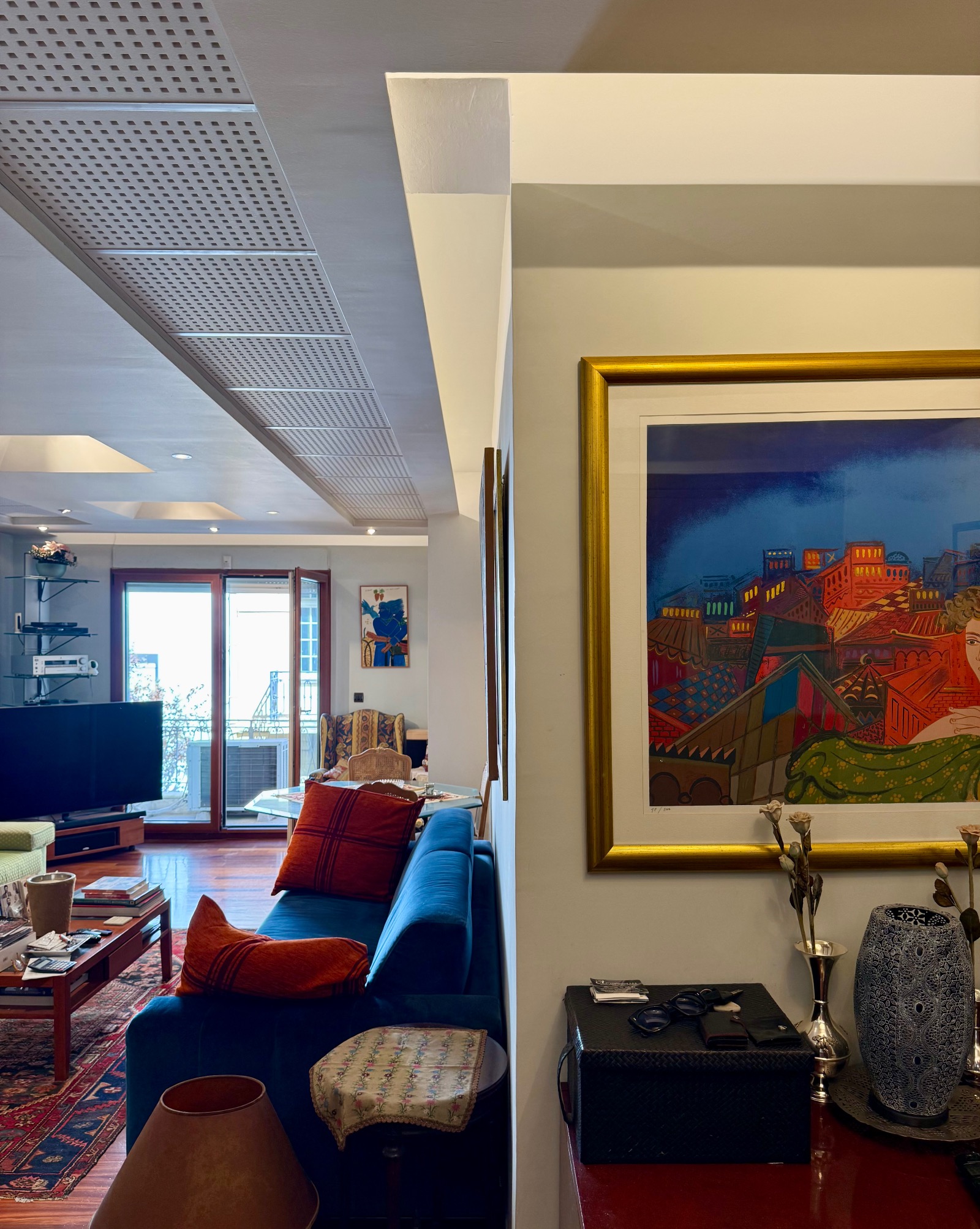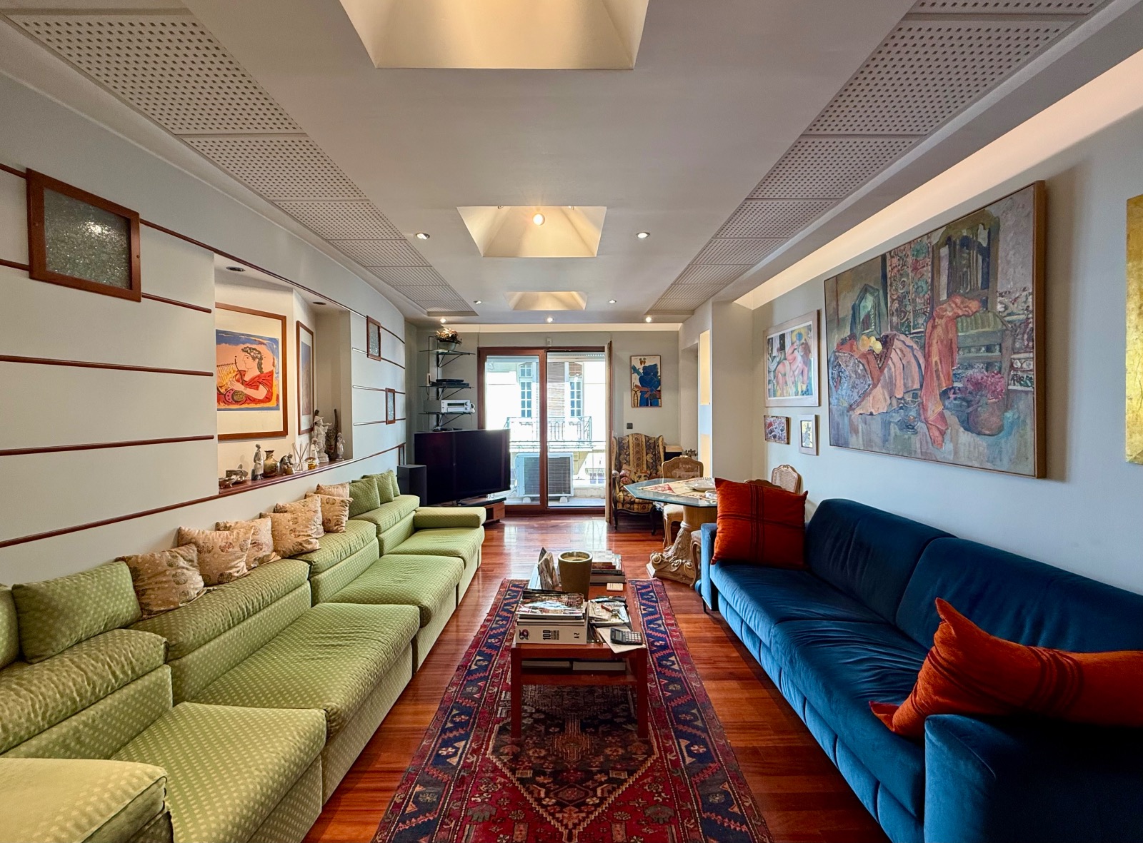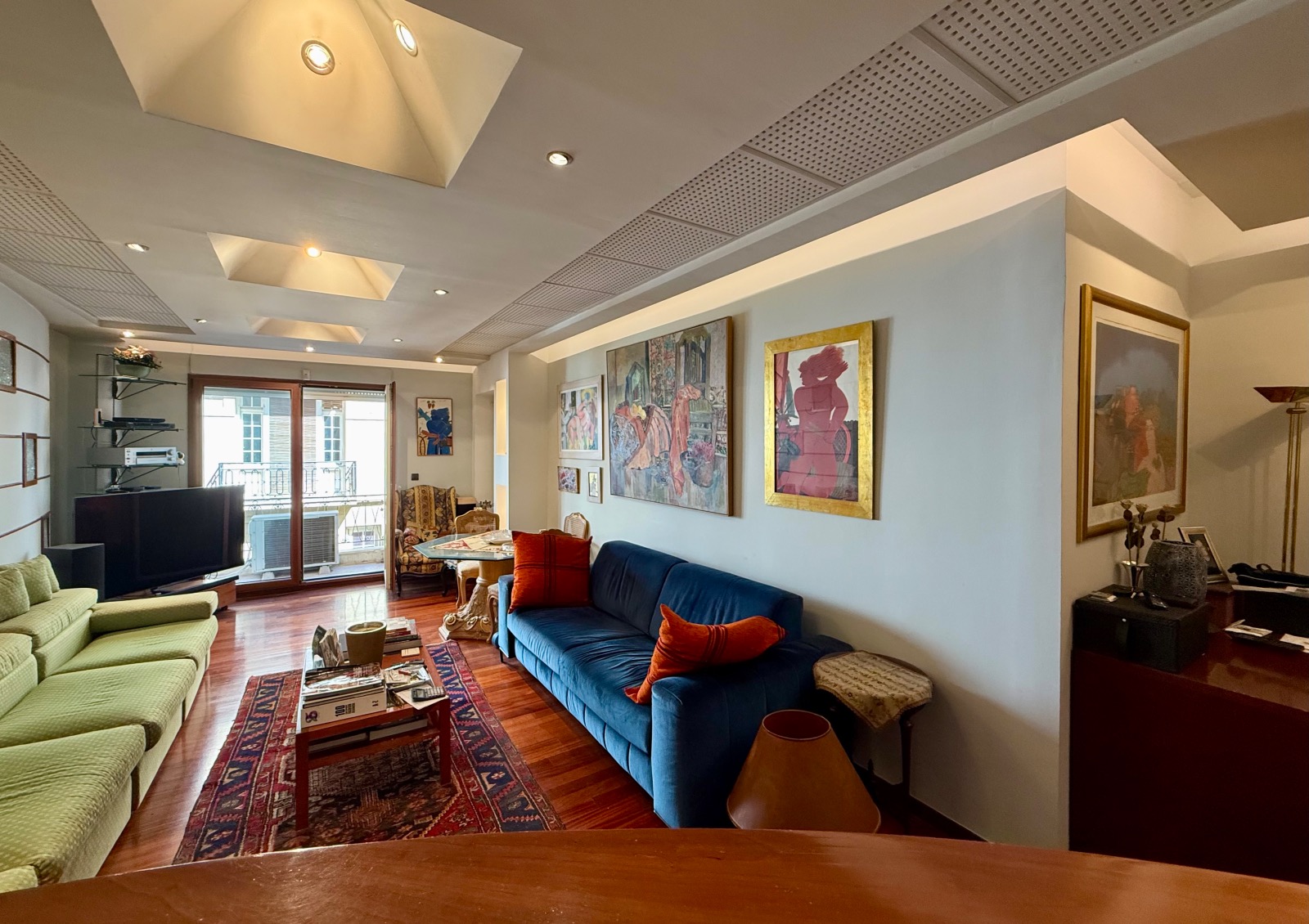 In front, a long reception area is leading to a balcony contemplating neoclassical buildings and small buildings of limited height. Progressing to the back a larger balcony benefits from a substantial and green uncovered area.