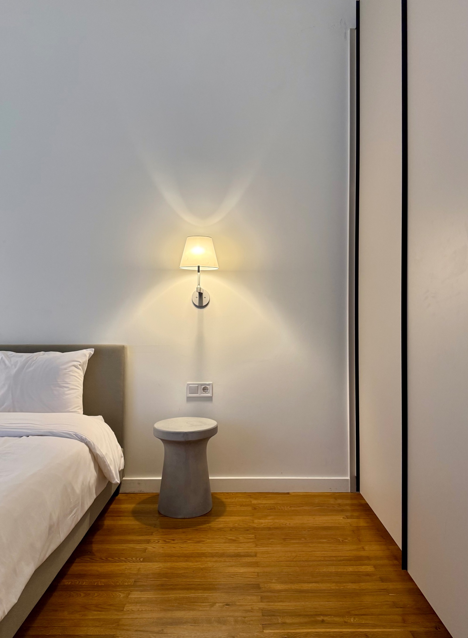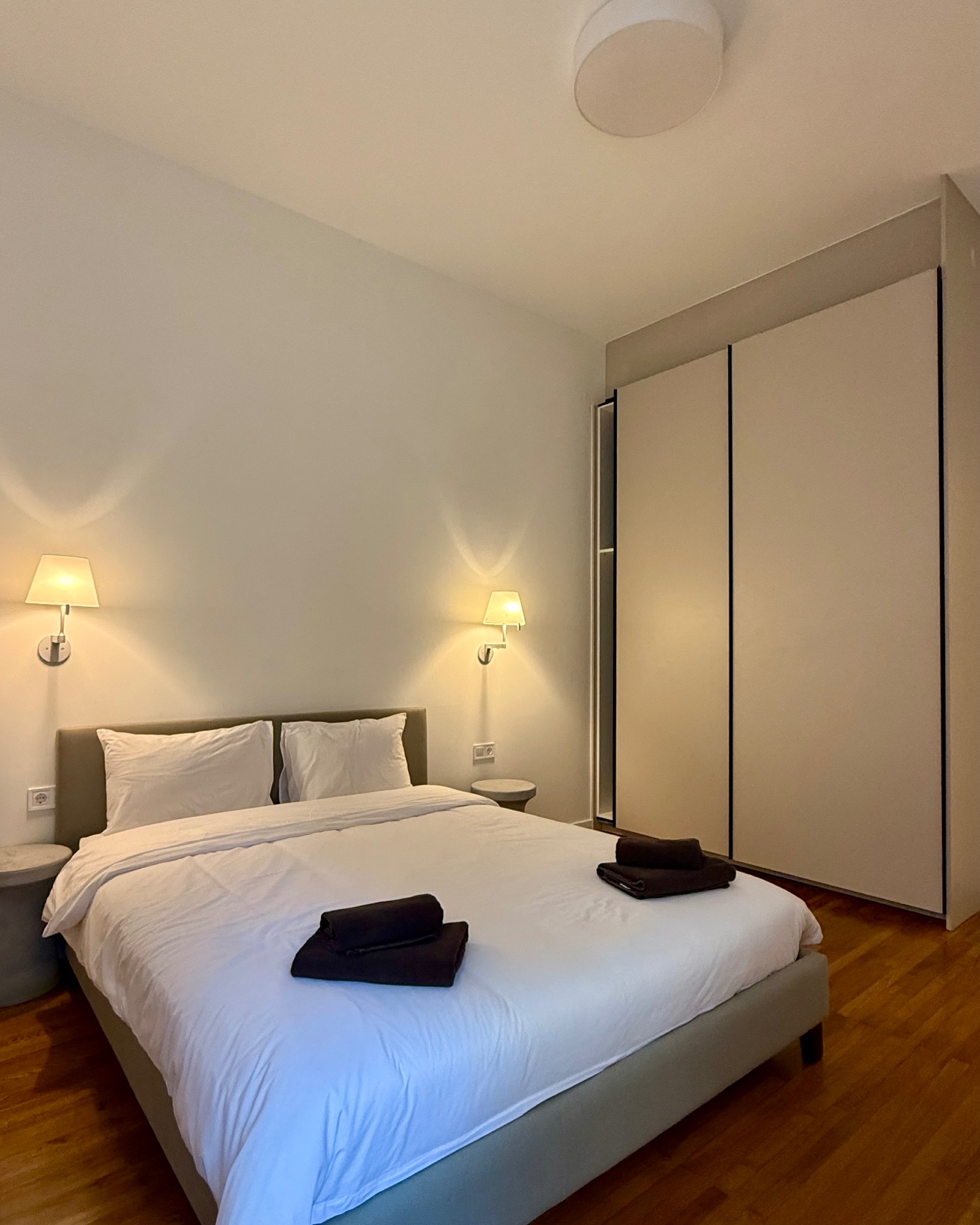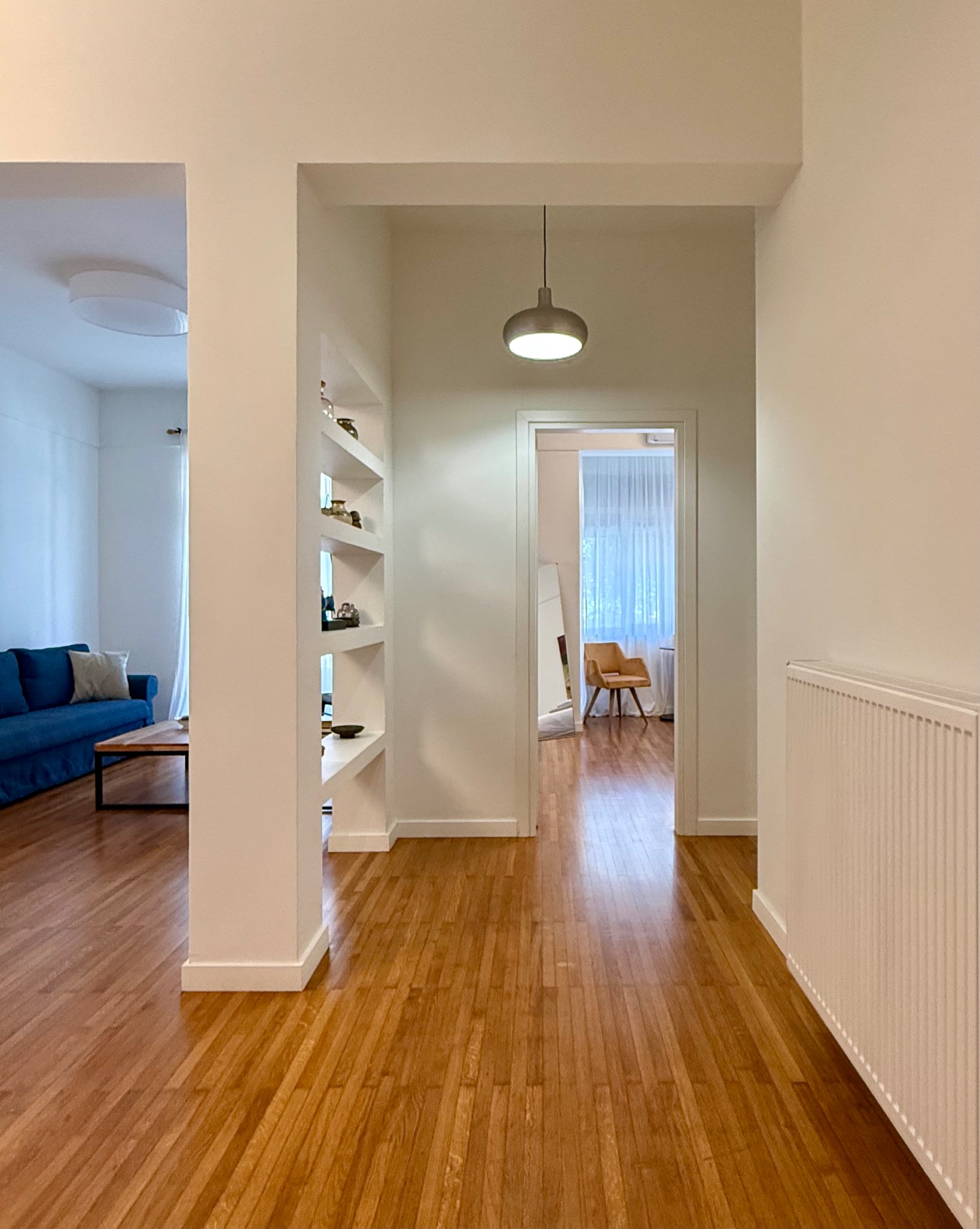 Το πρώτο διαμέρισμα, επιφάνειας 70 τ.μ., αποτελειται από άνετο υπνοδωμάτιο, σαλόνι, πλήρως εξοπλισμένη κουζίνα και μπάνιο, και μπαλκόνι στην πρόσοψη του κτηρίου. Το δεύτερο διαμέρισμα, συνολικής επιφάνειας 90 τ.μ., είναι διαμπερές και ιδιαίτερα φωτεινό. Αποτελειται από άνετο χωλ, ενιαίο χώρο σαλονιού και κουζίνας, δύο υπνοδωμάτια και μπάνιο. Διαθέτει μπαλκόνι στην πρόσοψη και στο πίσω μέρος του ακινήτου, προσβάσιμο από τα υπνοδωμάτια.