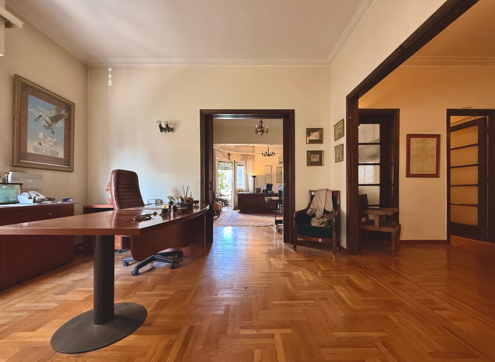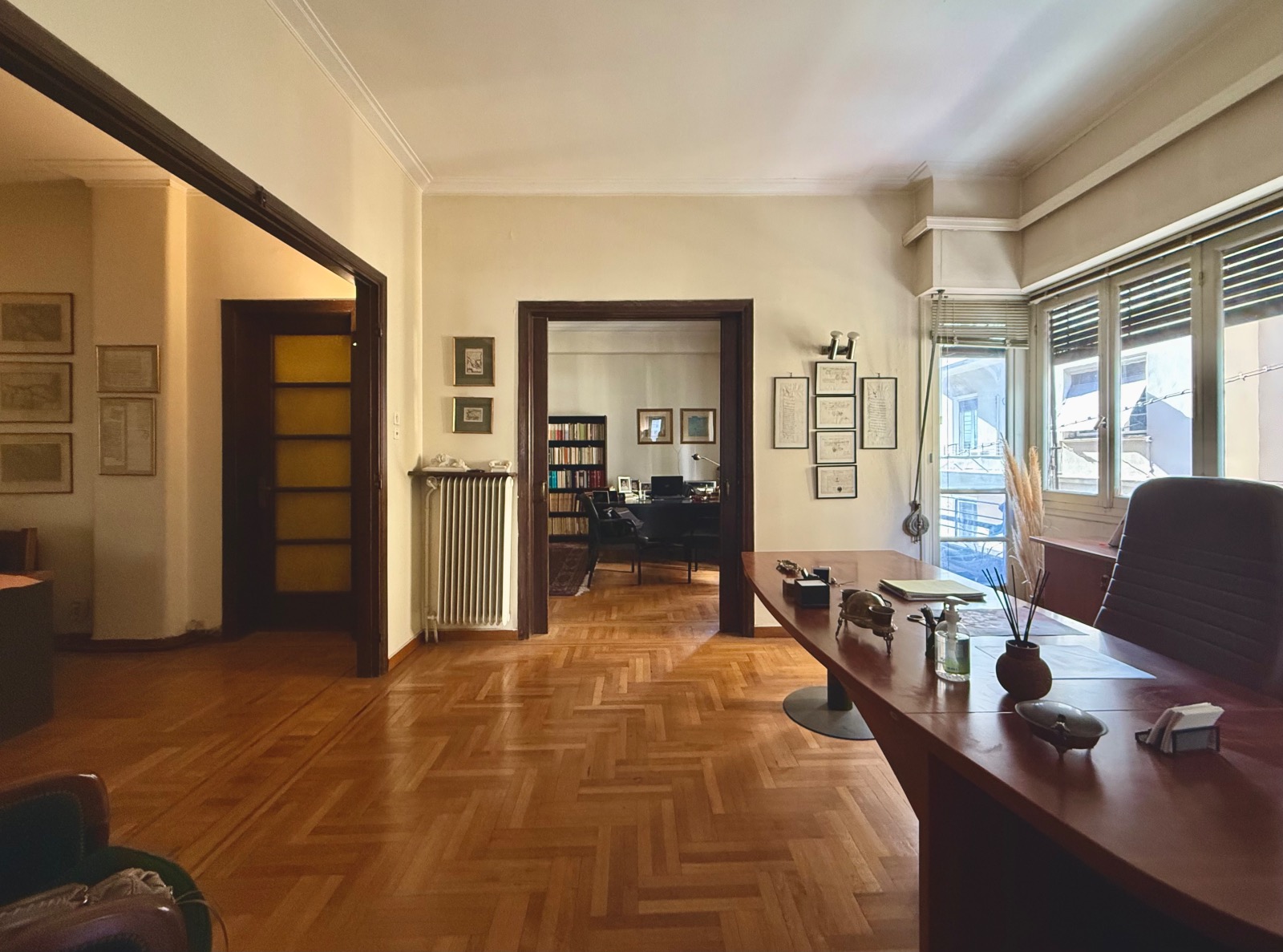 This 154 m2 property is located in Kolonaki in an elegant 1940's building. It is set in a corner and enjoys high ceiling and many windows.