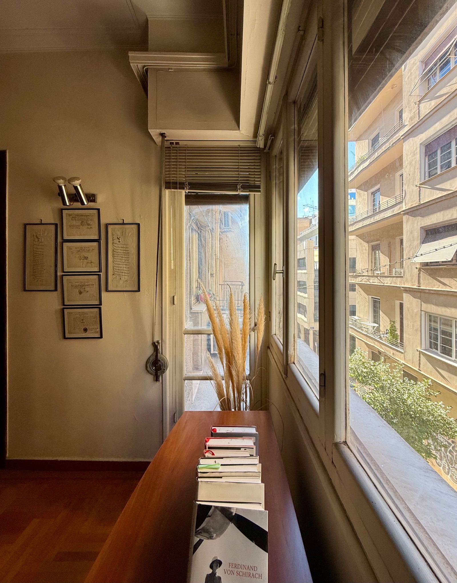 The flat stands in good condition. Beautiful original wooden floors and frames have been well maintained. There are two long balconies in front, four (4) large rooms spaces in front, kitchen and bathroomslooking at the back would need a renovation. A 6 m2 storage space in the basement is attached to the property.