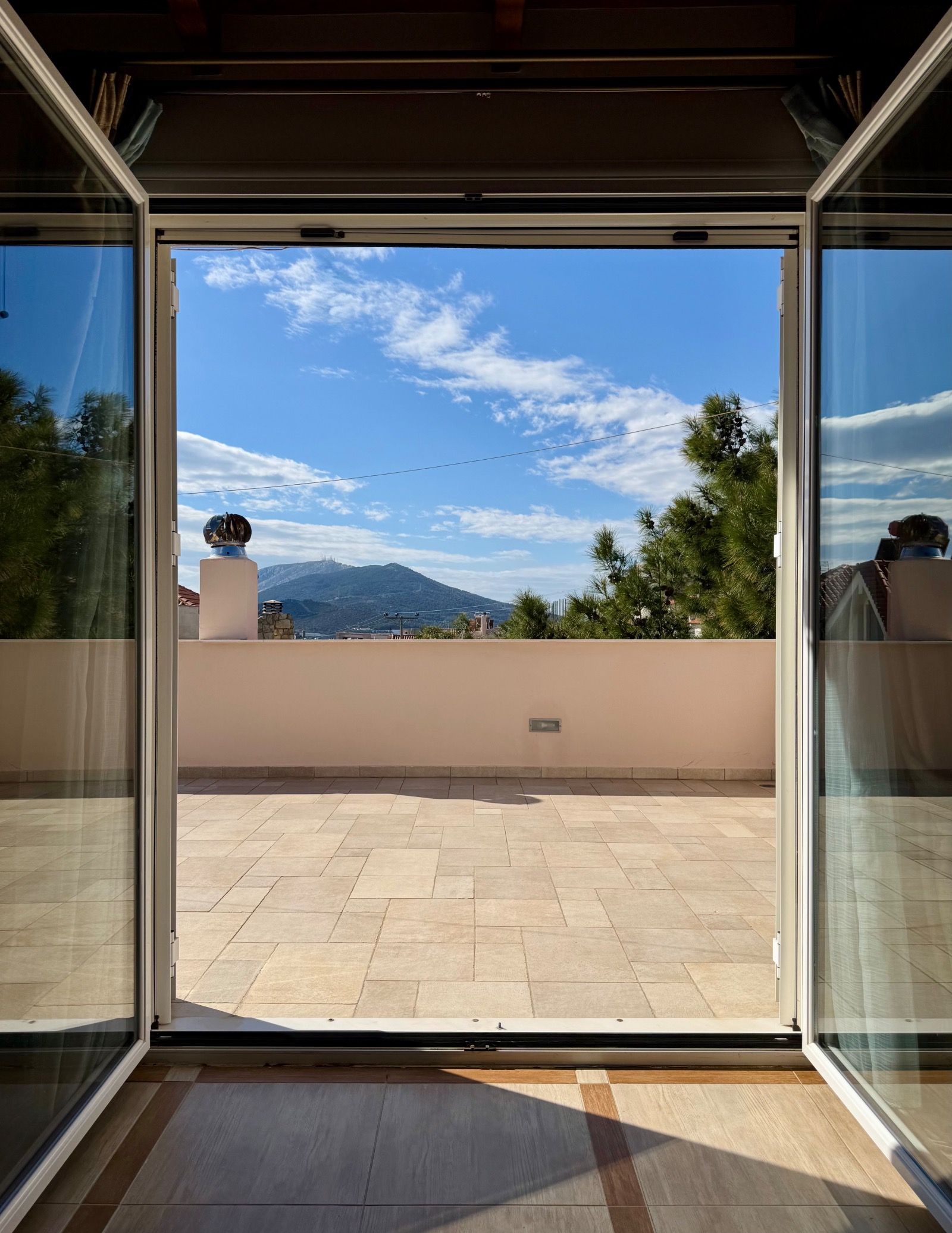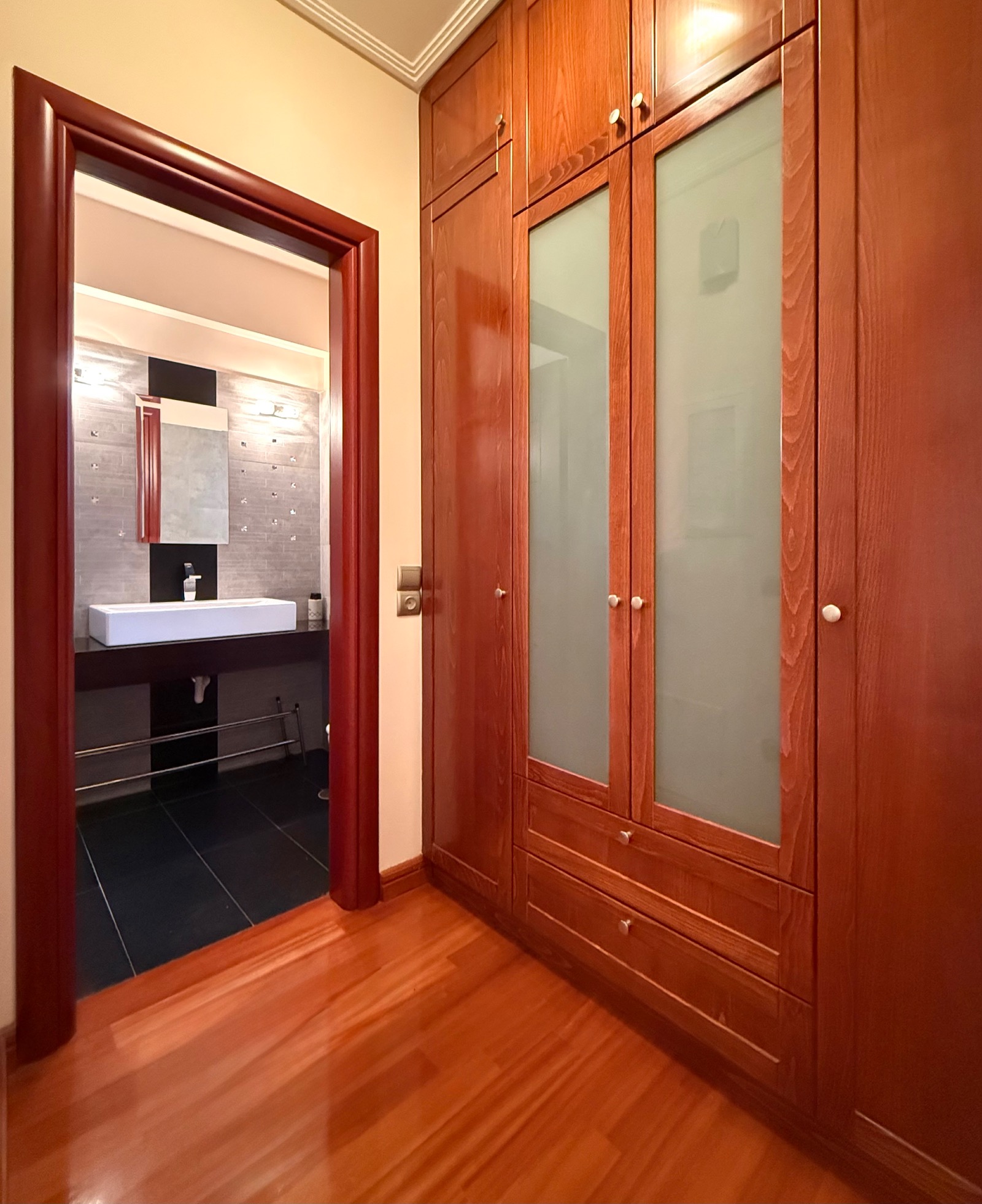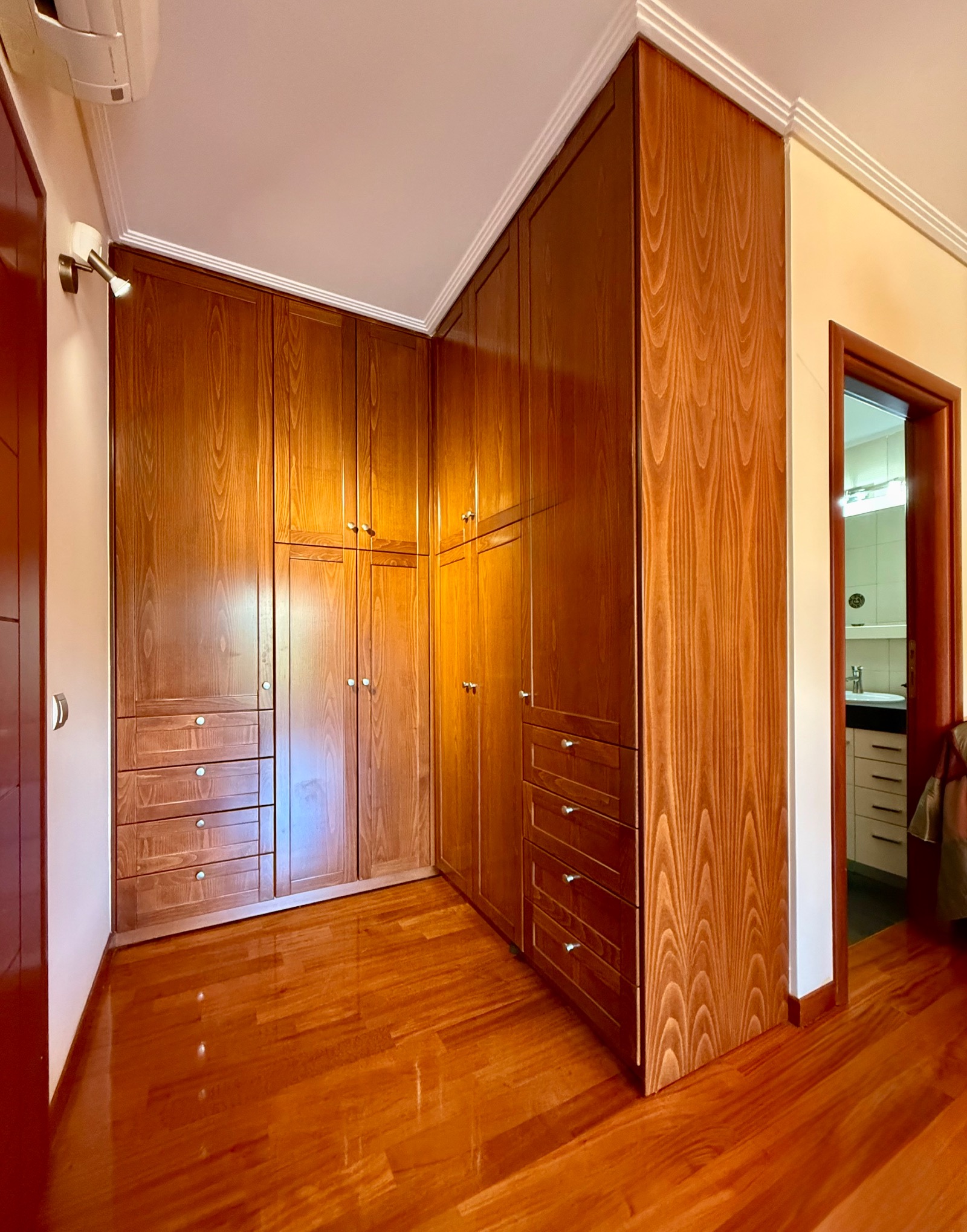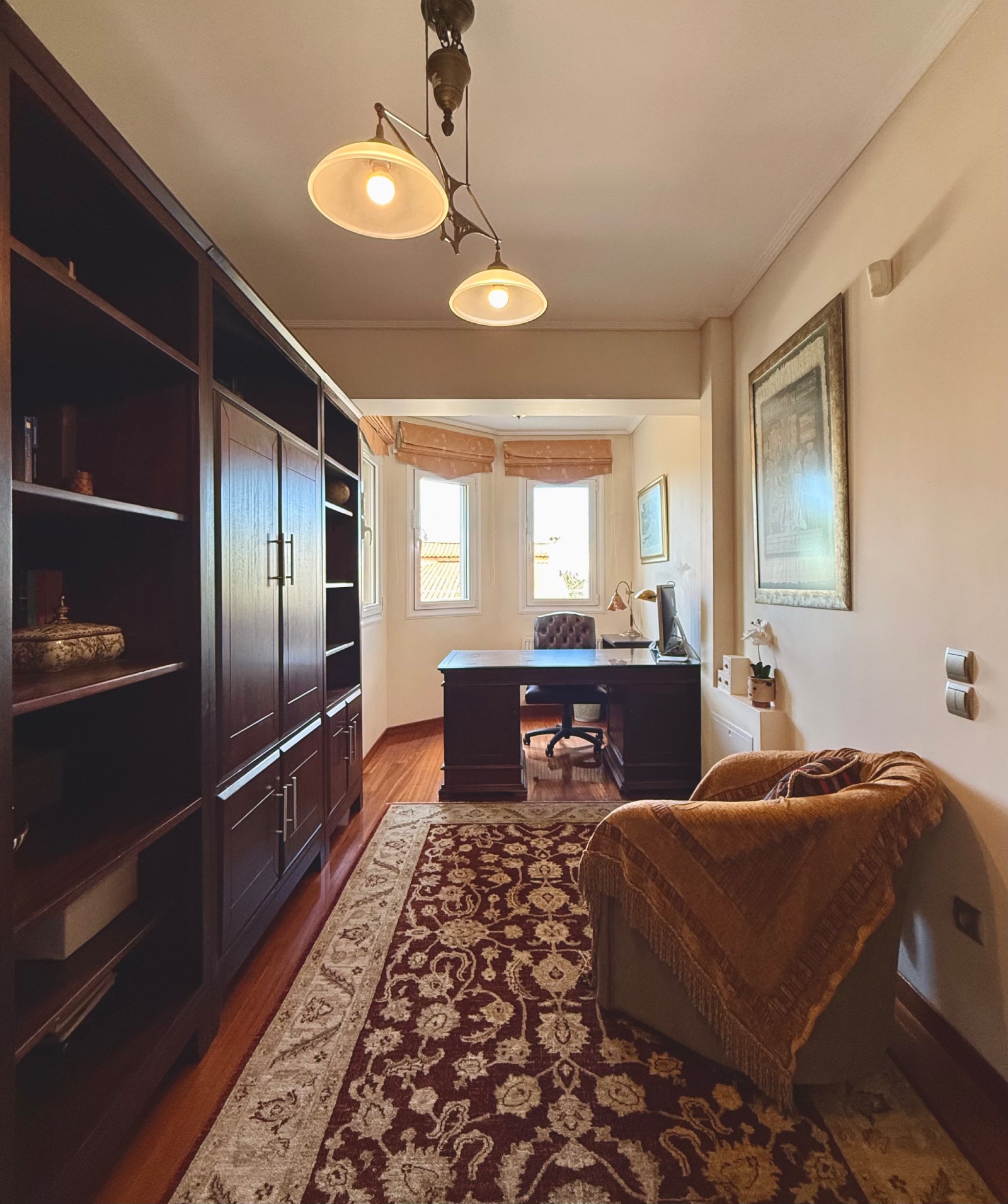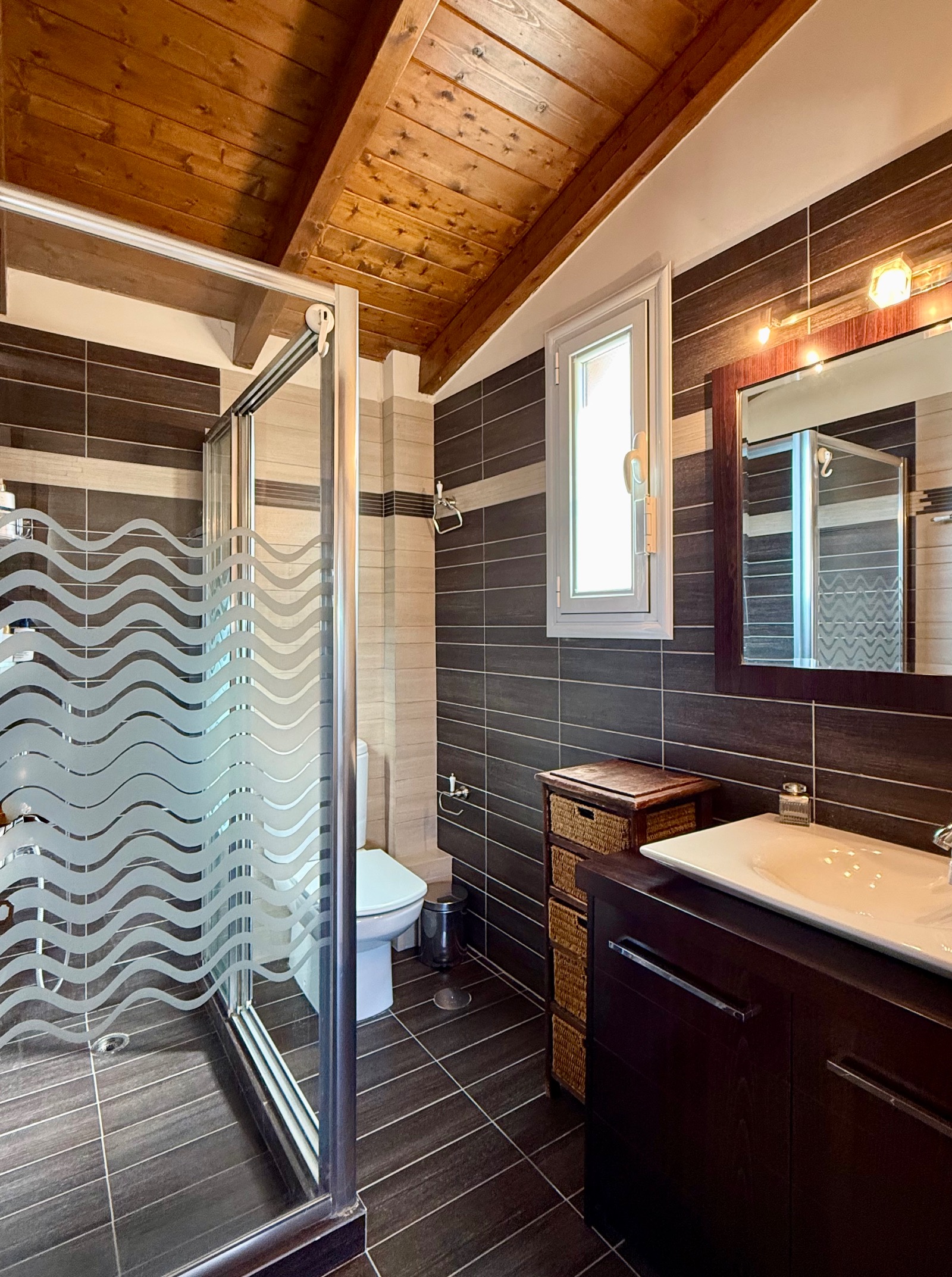 On the 1st floor there are three bedrooms (1 master with its own bathroom), an open office area and a second full bathroom with jaccuzzi. On the second and last floor an open space (guests' room, gym, etc...) with high ceiling is facing a large veranda of about 50 m2 with a nice unobstructed views. A full bathroom is also provided.