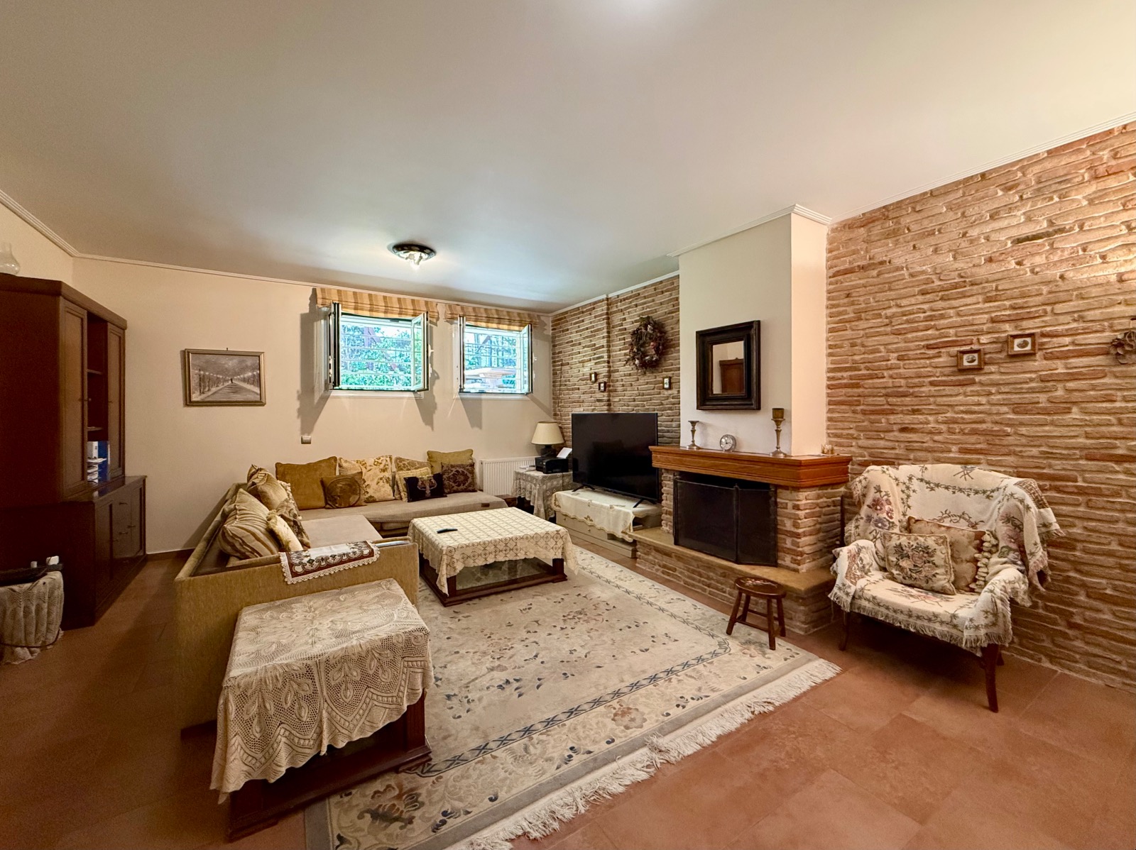The half basement is like a separate flat. It presents a cosy living area with a second fire place, a full bathroom, a separate bedroom and a laundry room. Last there is a closed parking spot for two vehicles and a heating room for the oil boiler.