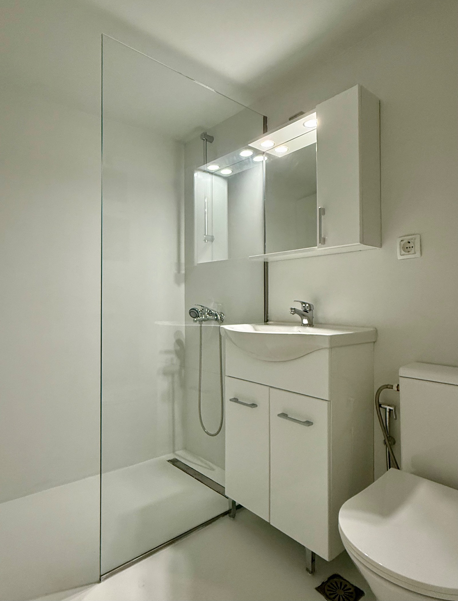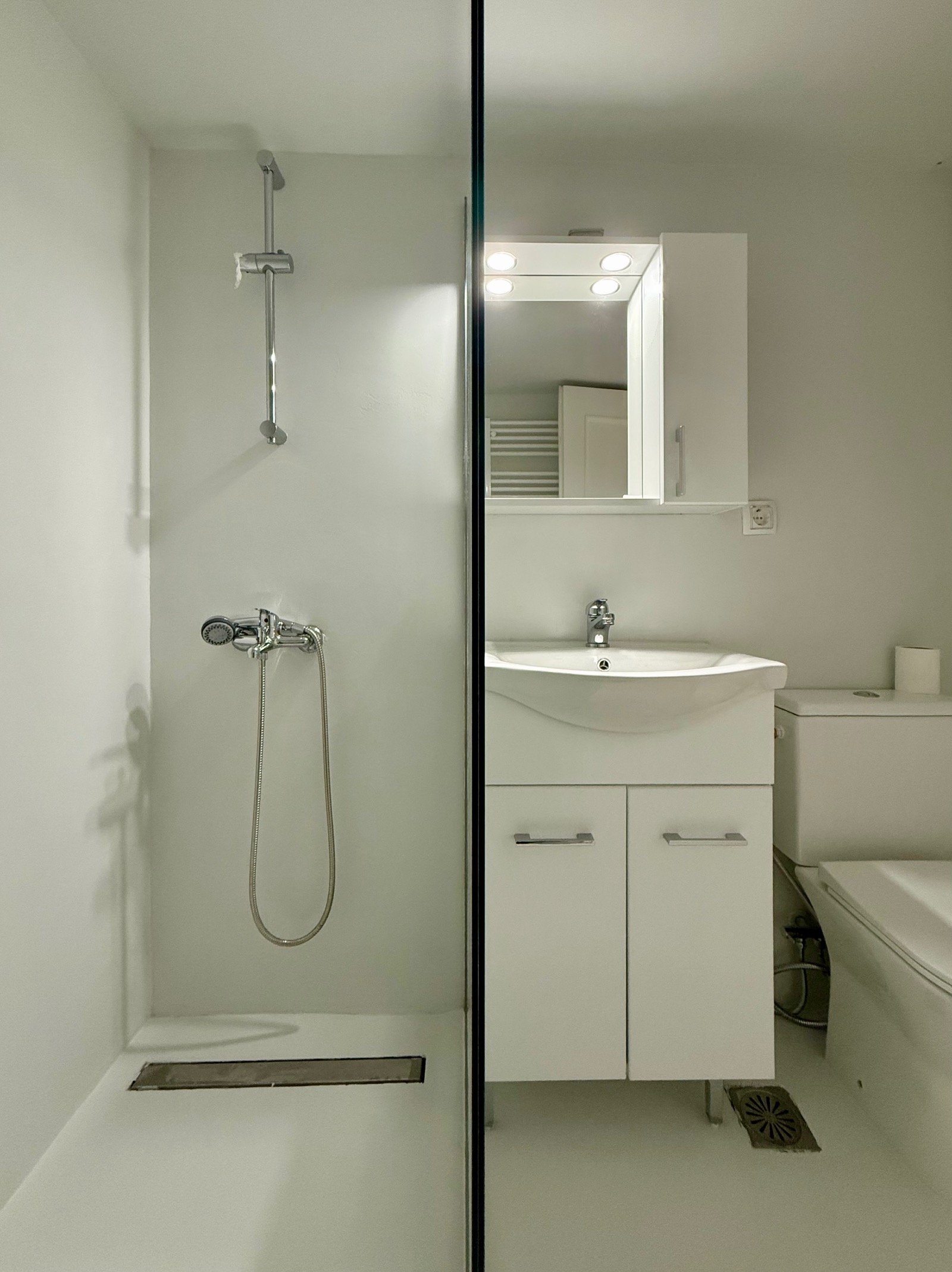It consists of two rooms in front looking to the balcony, a minimal bathroom with built-in shower and a kitchen to be completed. The windows are double -glazed, the overall condition is perfect, the renovation has been managed by an architect. The inner lay-out may slightly be modified if the kitchen would unite with the living area, or that may also remain as is if closed kitchen is preferable.