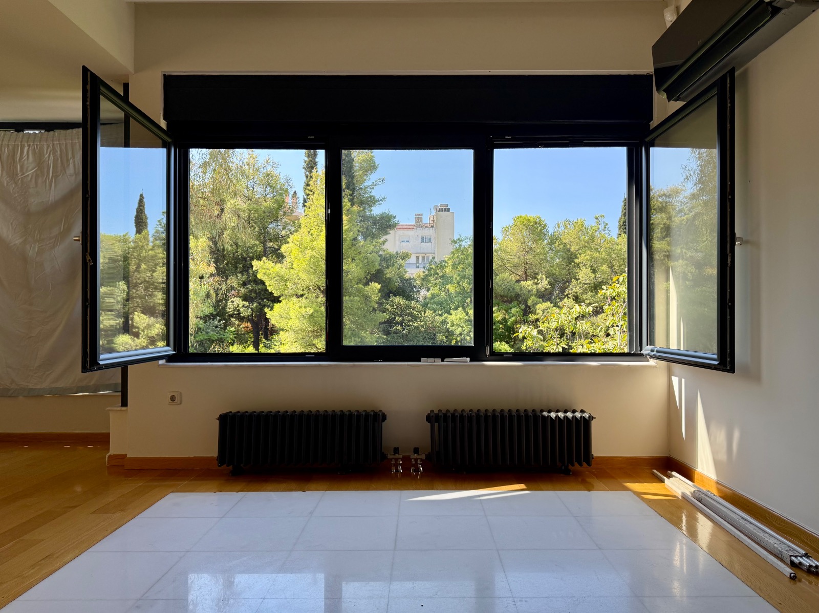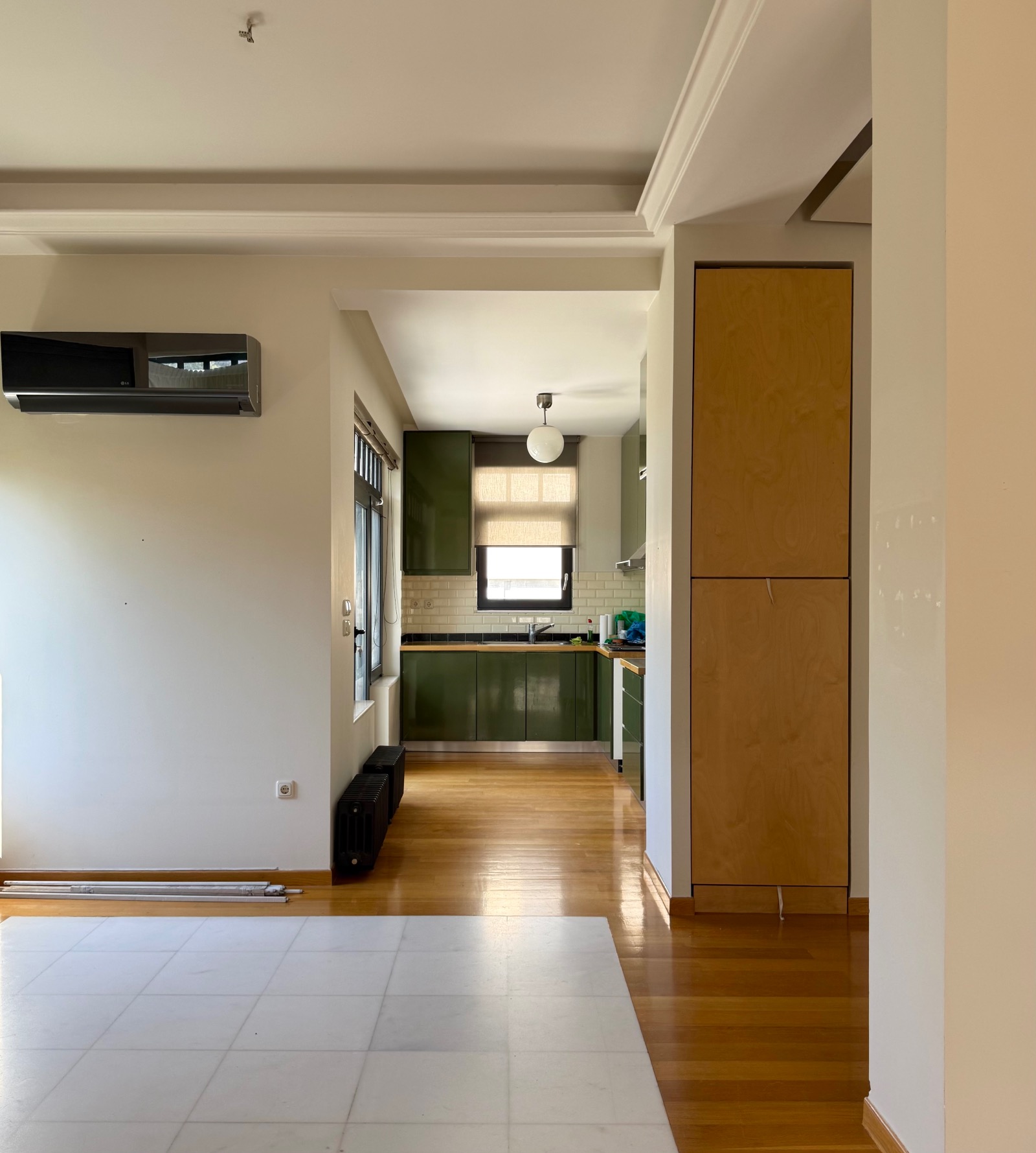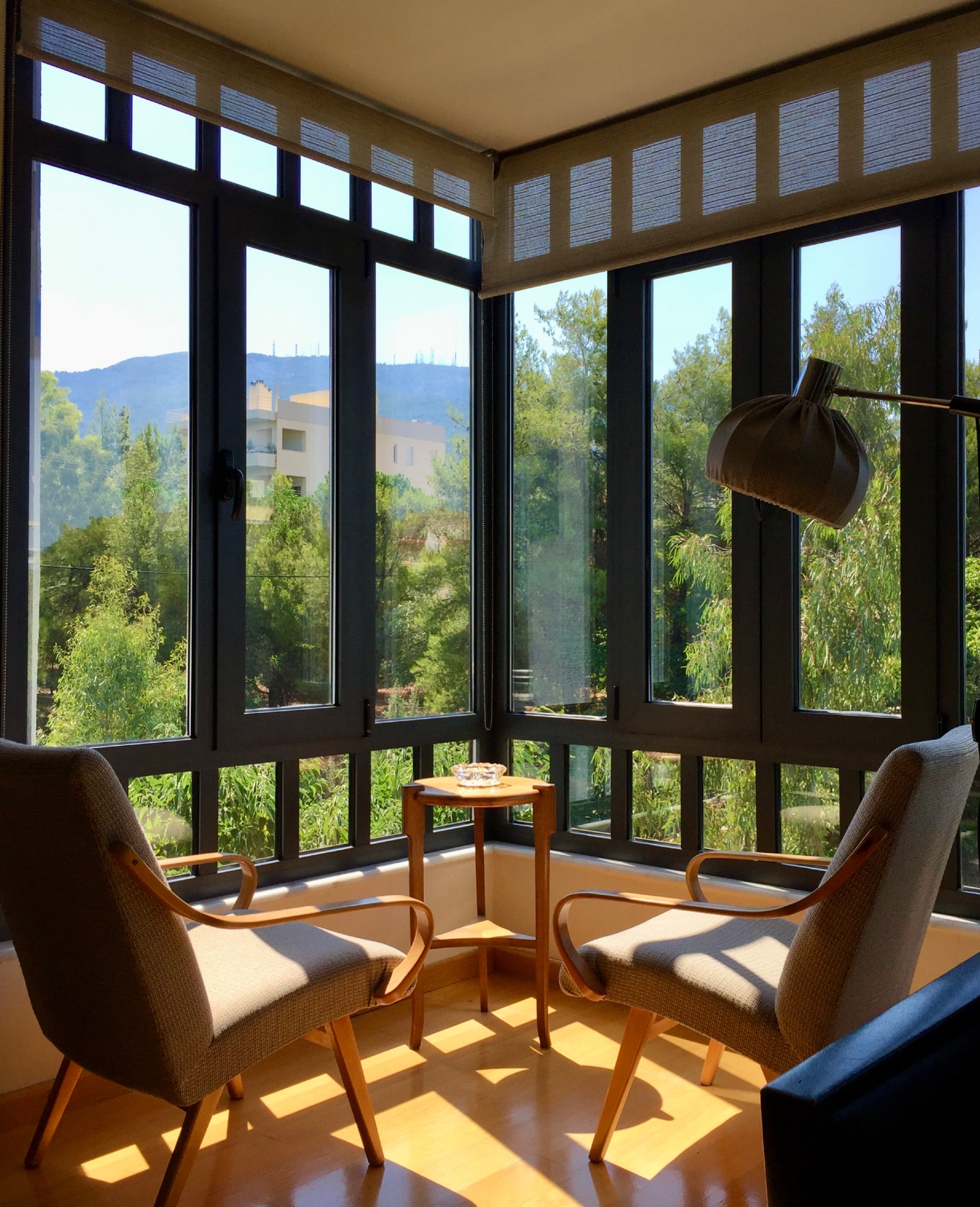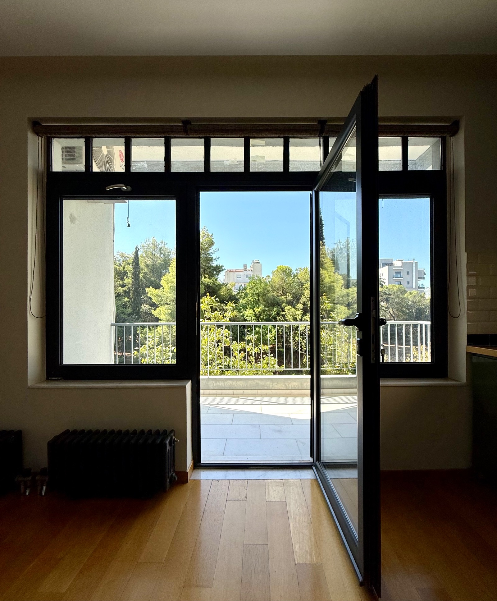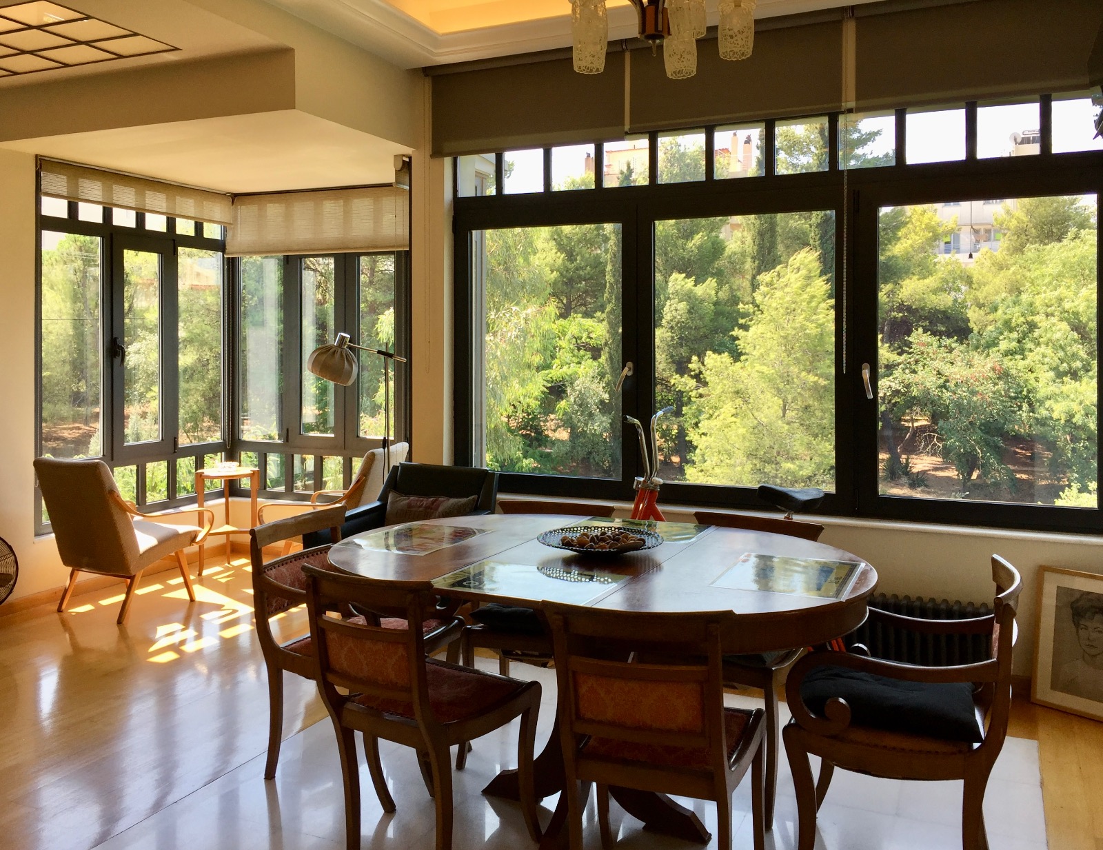 This 115 sqm floor flat is idealy located facing an unobstructed natural landcape topped by the Ymittos mountain. Set in a late 1960's family building on the elevated 1st floor the property has been fully redesigned around 2010 to optimize this outstanding view.