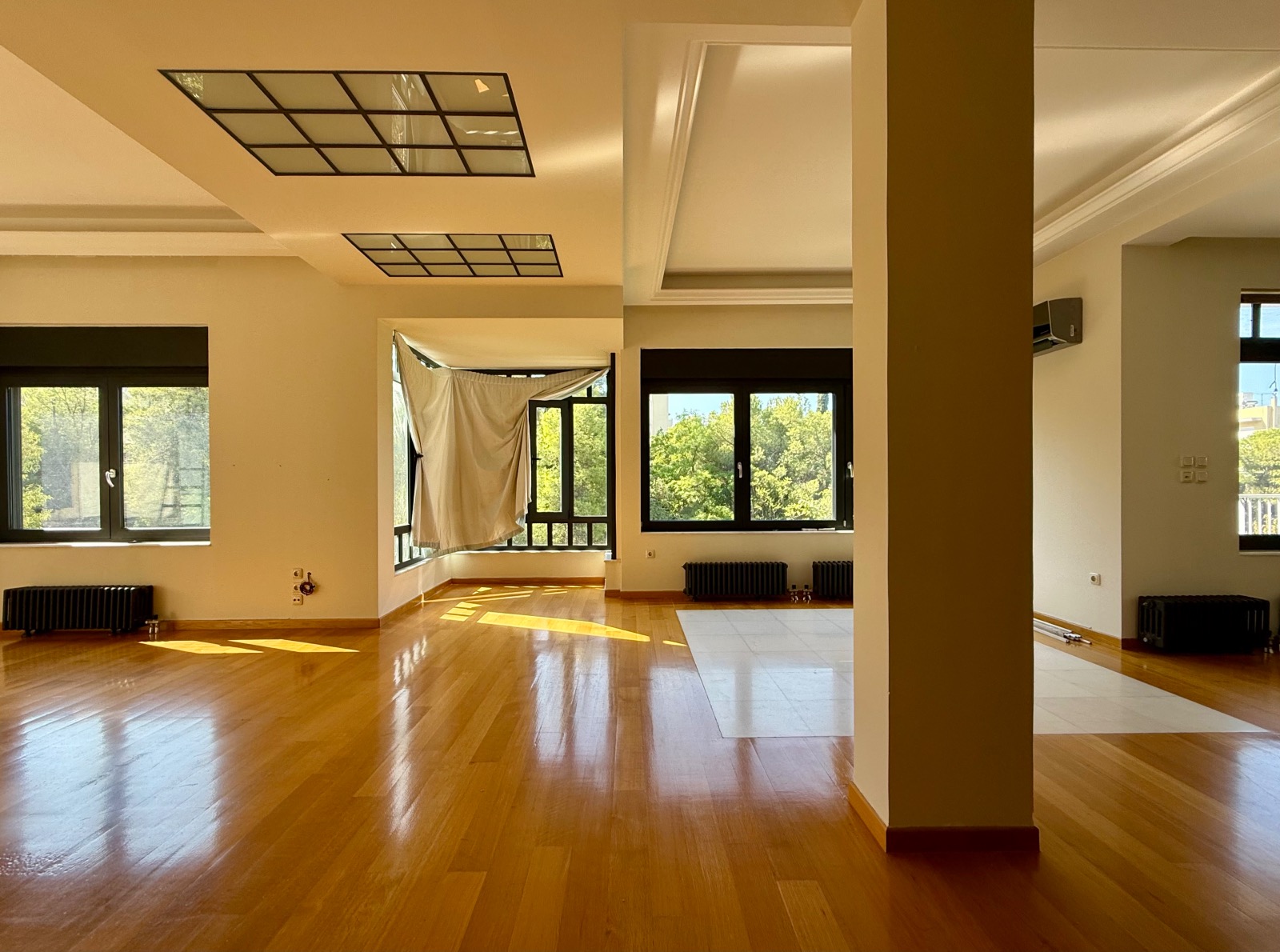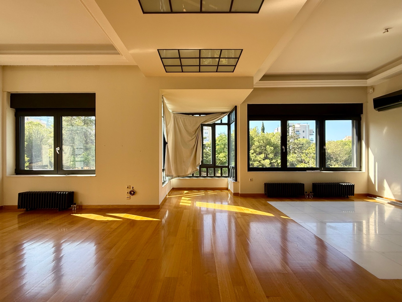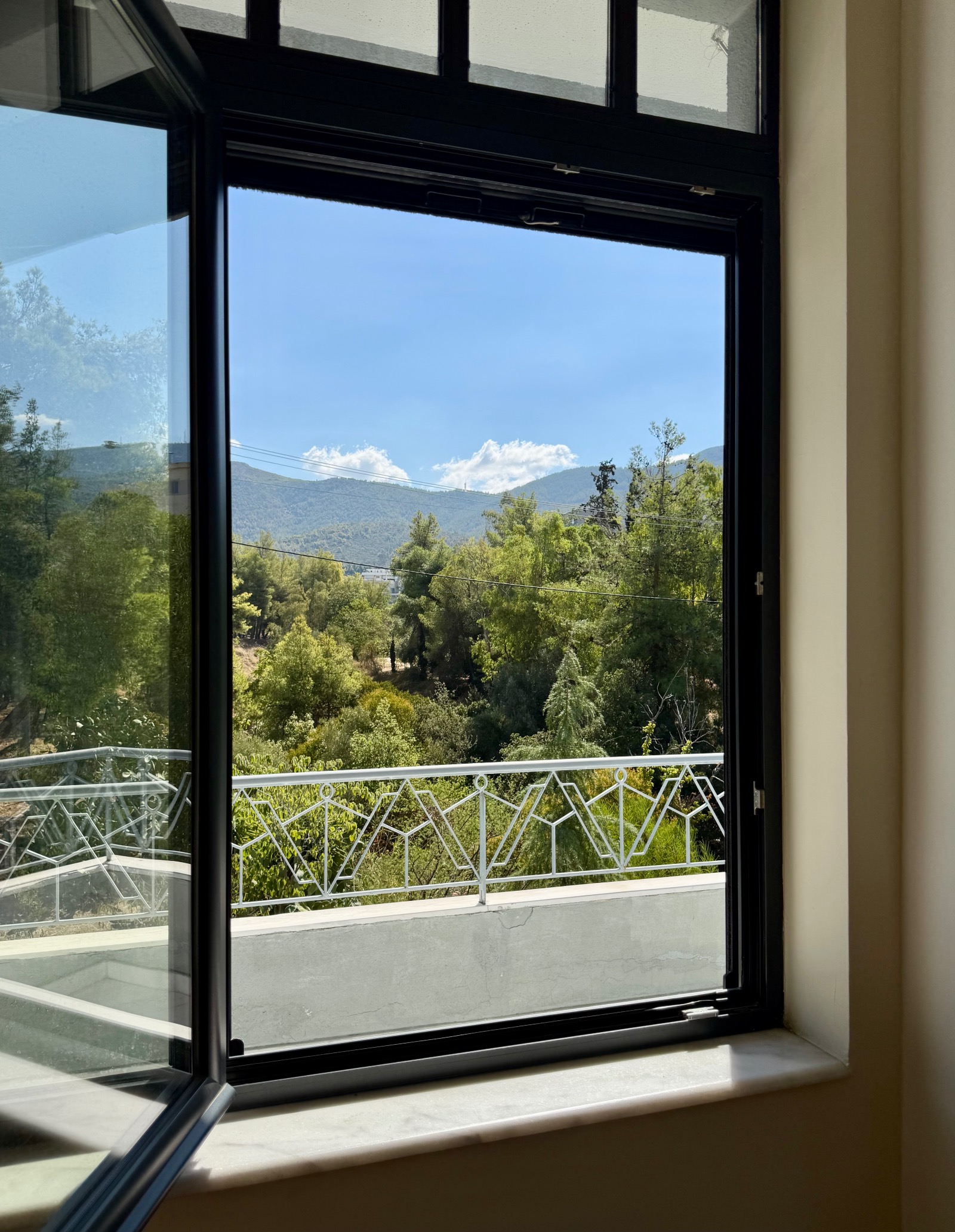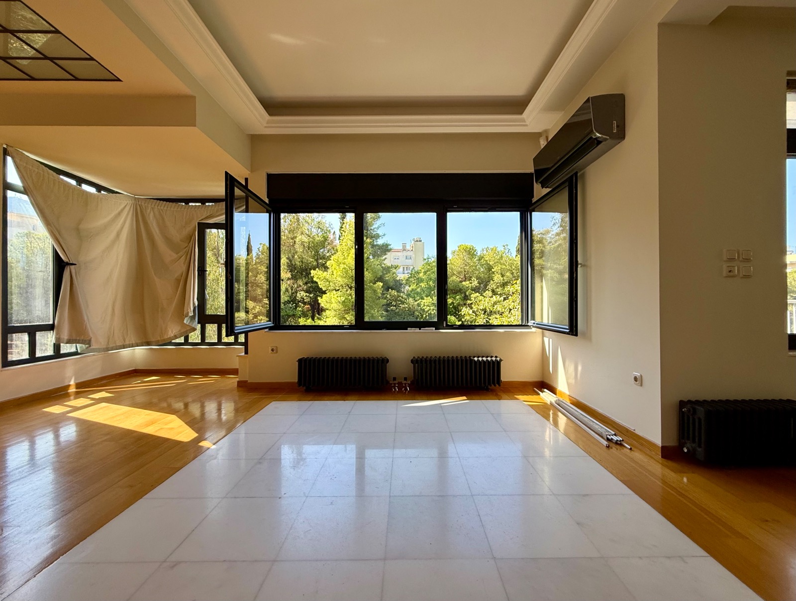 This 115 sqm floor flat is idealy located facing an unobstructed natural landcape topped by the Ymittos mountain. Set in a late 1960's family building on the elevated 1st floor the property has been fully redesigned around 2010 to optimize this outstanding view.