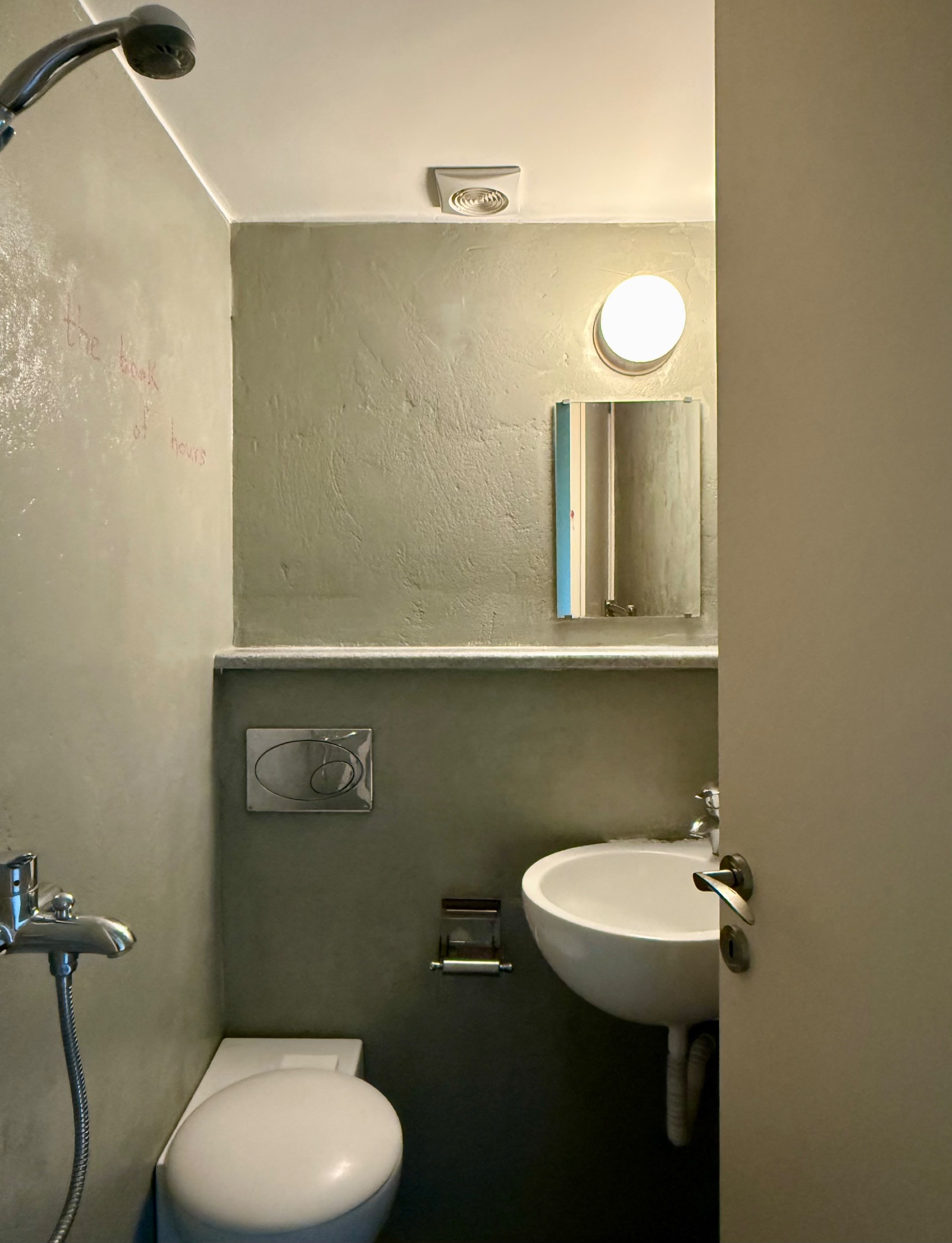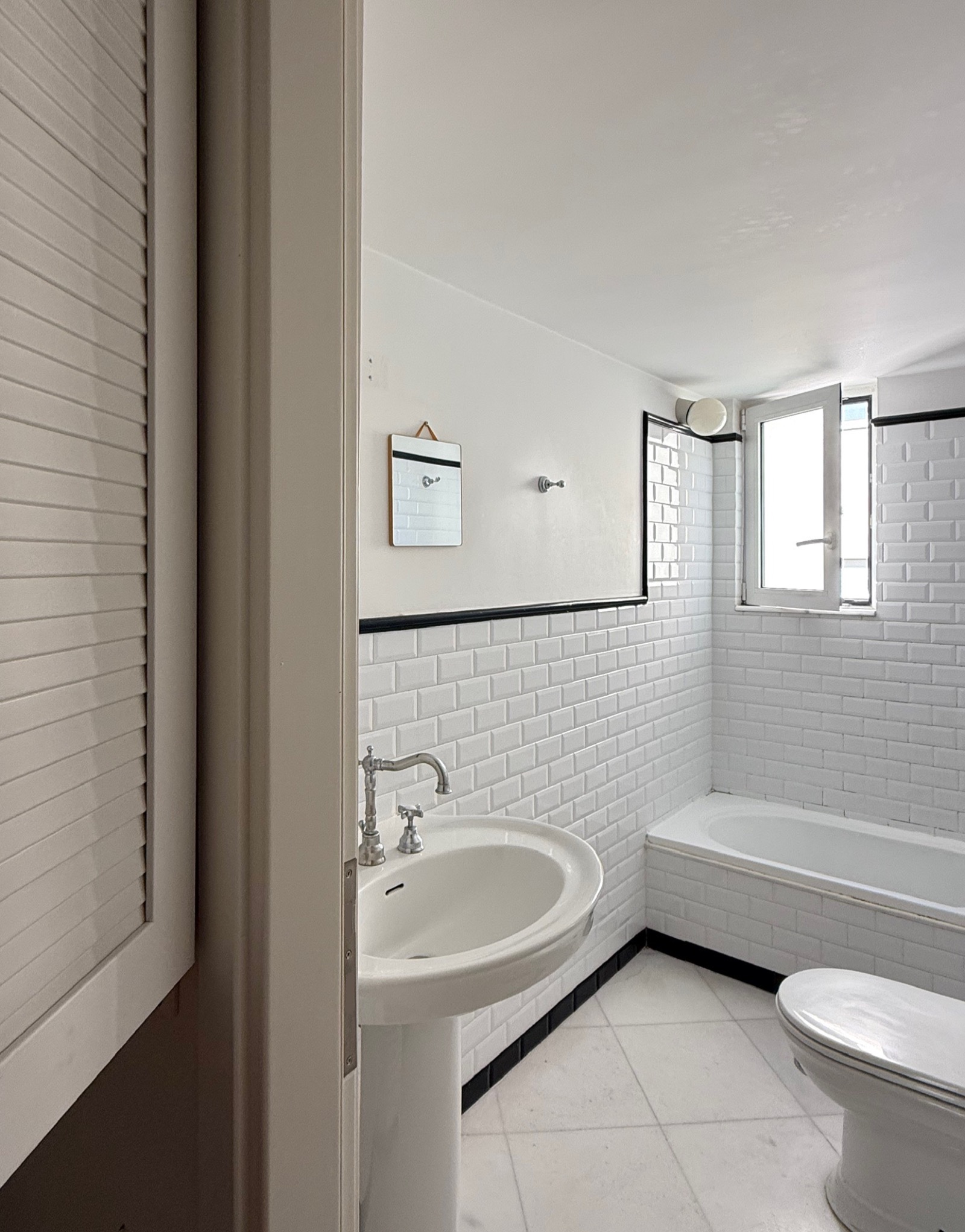 Reception areas and kitchen unfold paralell to the green undistracted thanks to the continuous bay windows. Two balconies on both end, one on the living area and the other by the kitchen, balance the front lay-out. Dining area is smartly indicated by a white-marble flooring on the one side of the living area next to the kitchen while a bright oak flooring covers most of the flat's surface. Kitchen closets stand out with their deep green tone.