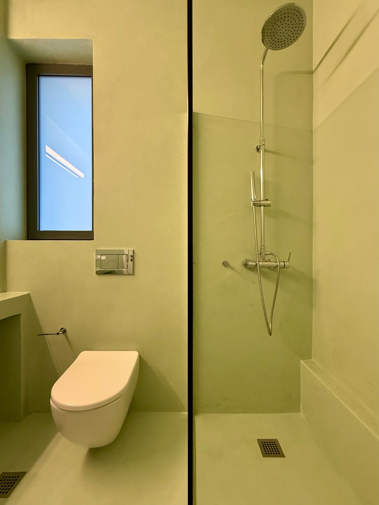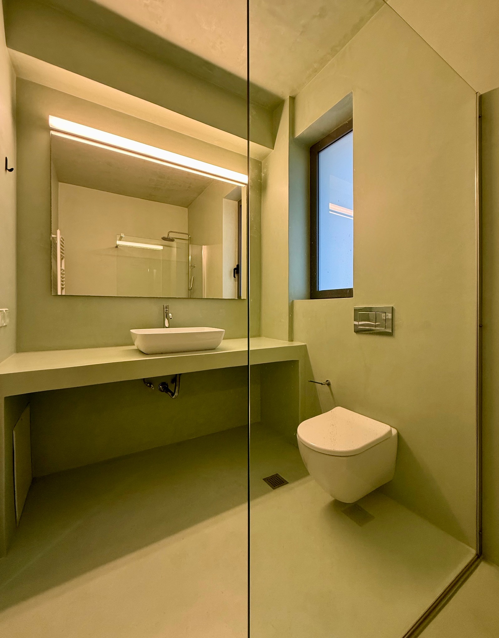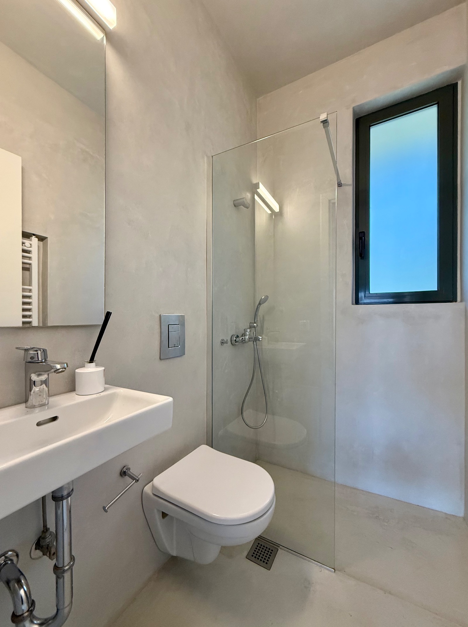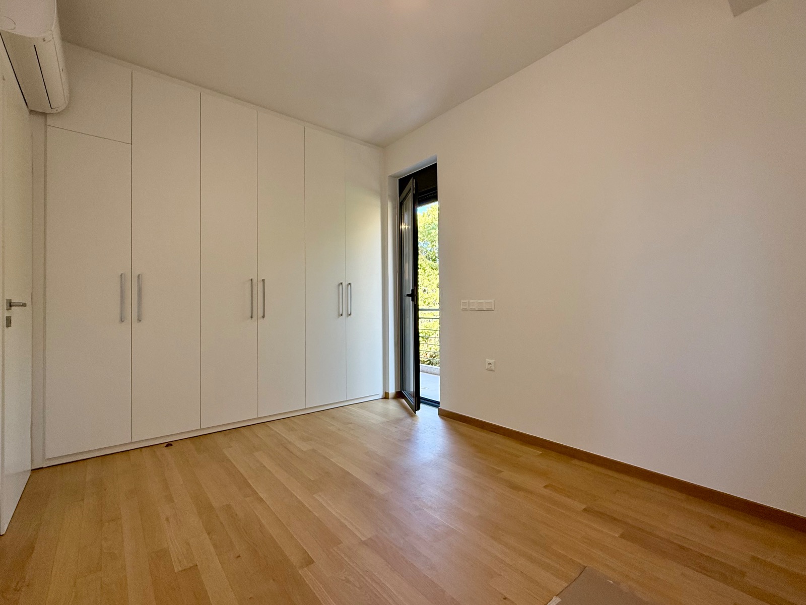 Διαθέτει δυο υπνοδωμάτια με ανεξάρτητα μπαλκόνια και δυο μπάνια κατασκευασμένα με την τεχνοτροπία τσιμεντοκονίας. Η θέα είναι ανοικτή και βλέπει στο πράσινο της περιοχής.