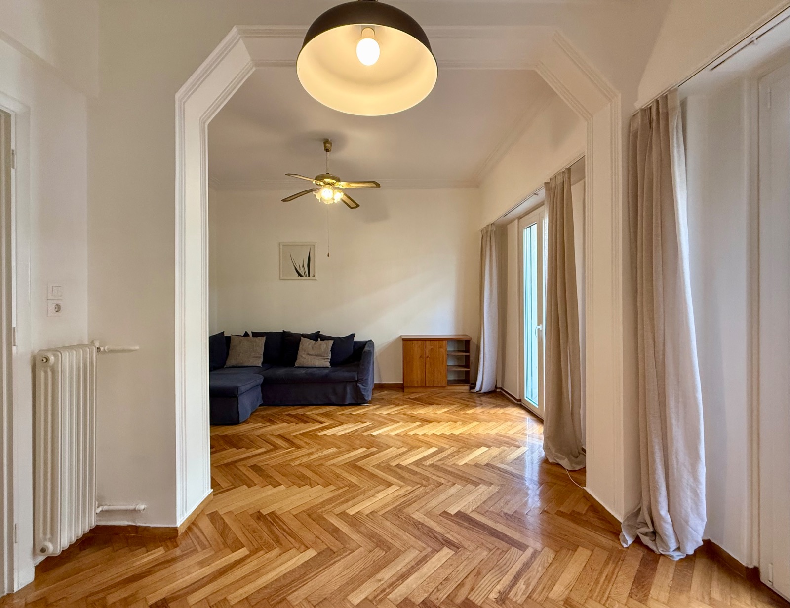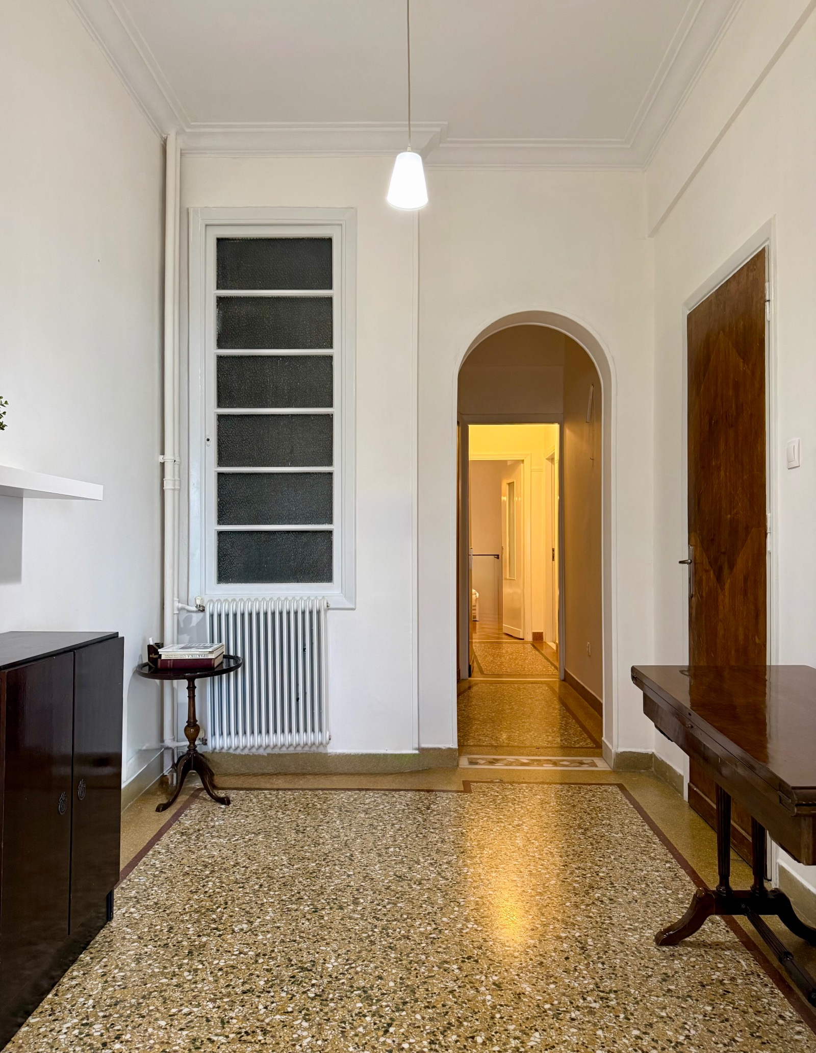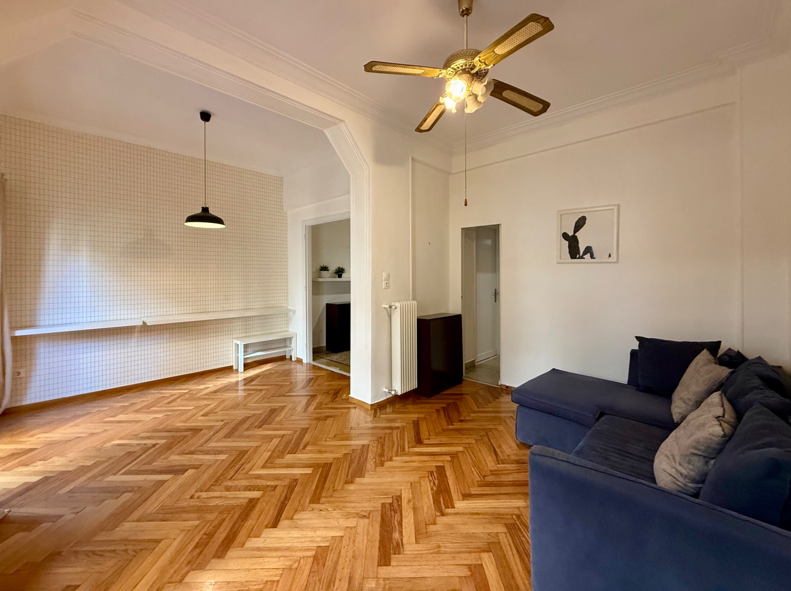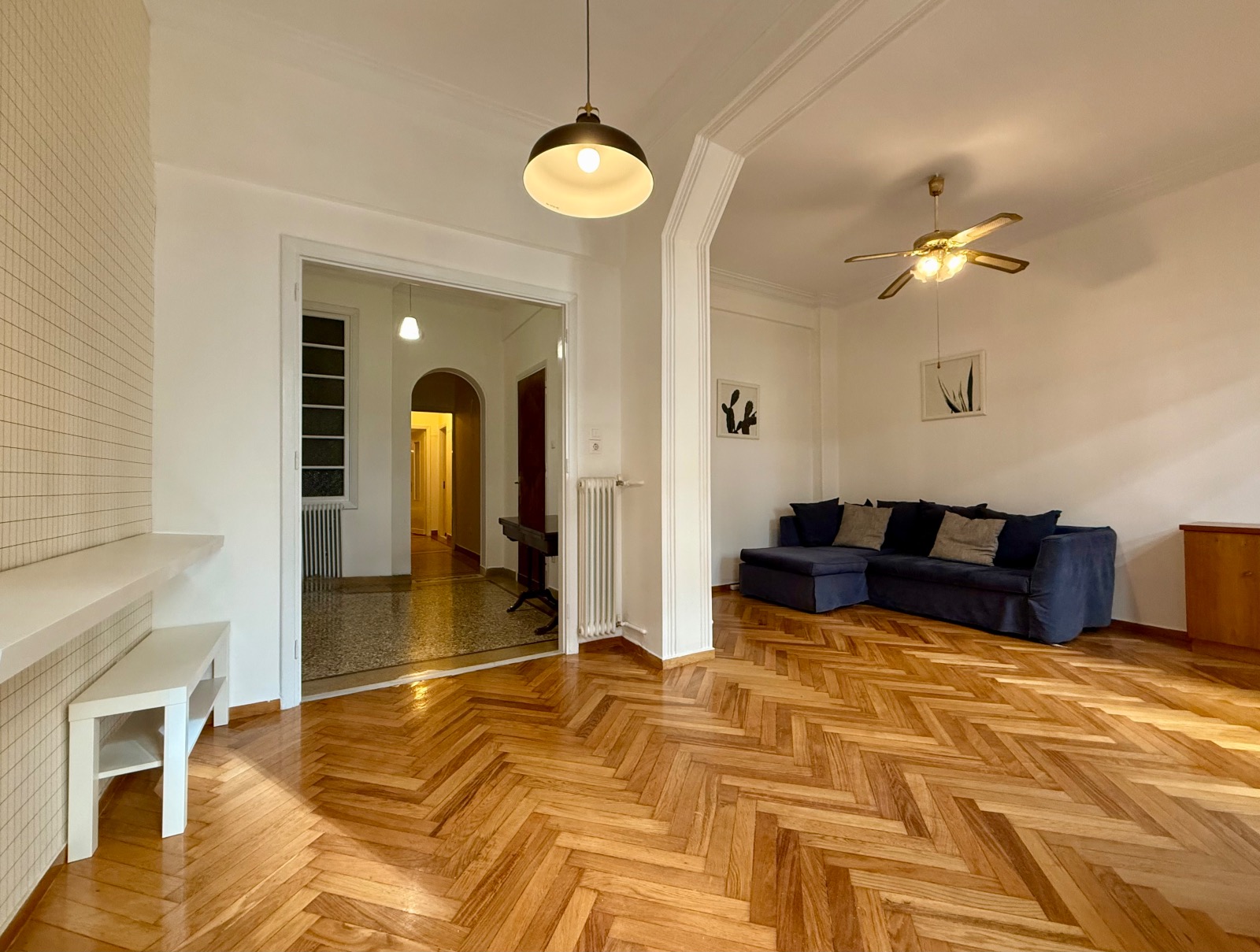 It is cross-ventilated with two rooms at the back looking to a small uncovered area. In front a voluminous living area in two parts unfolds along a narrow balcony. Between the entrance and the reception areas a hall is leading to the kitchen and a storage room. Ceiling is high and bright wooden floors mix with mosaic in harmony with the "retro" character. Most of the original materials have been very well maintained and various upgrades have been made such as double-glazed windows and two A/C units in the bedrooms.