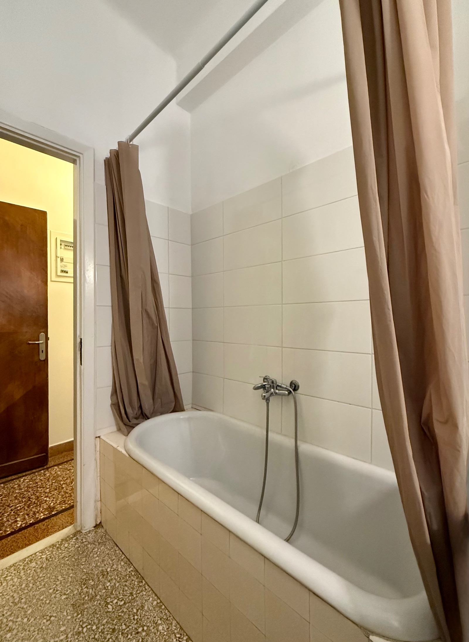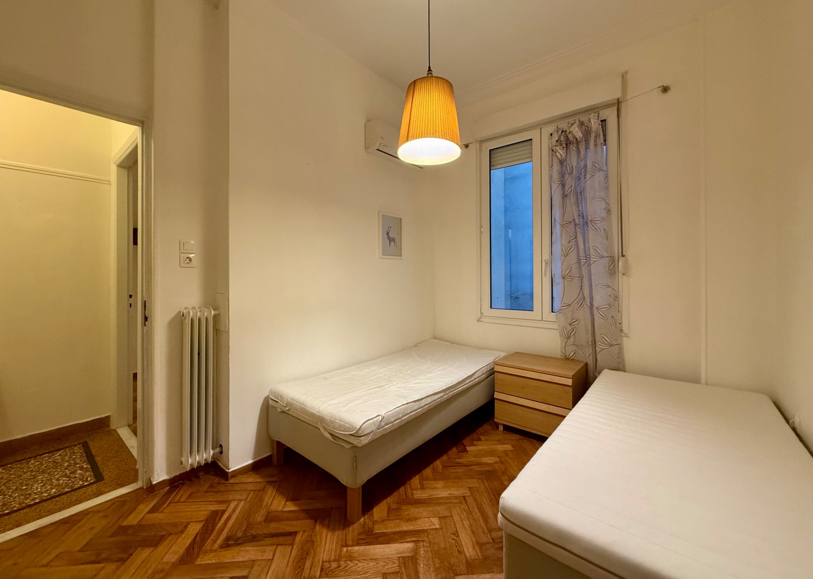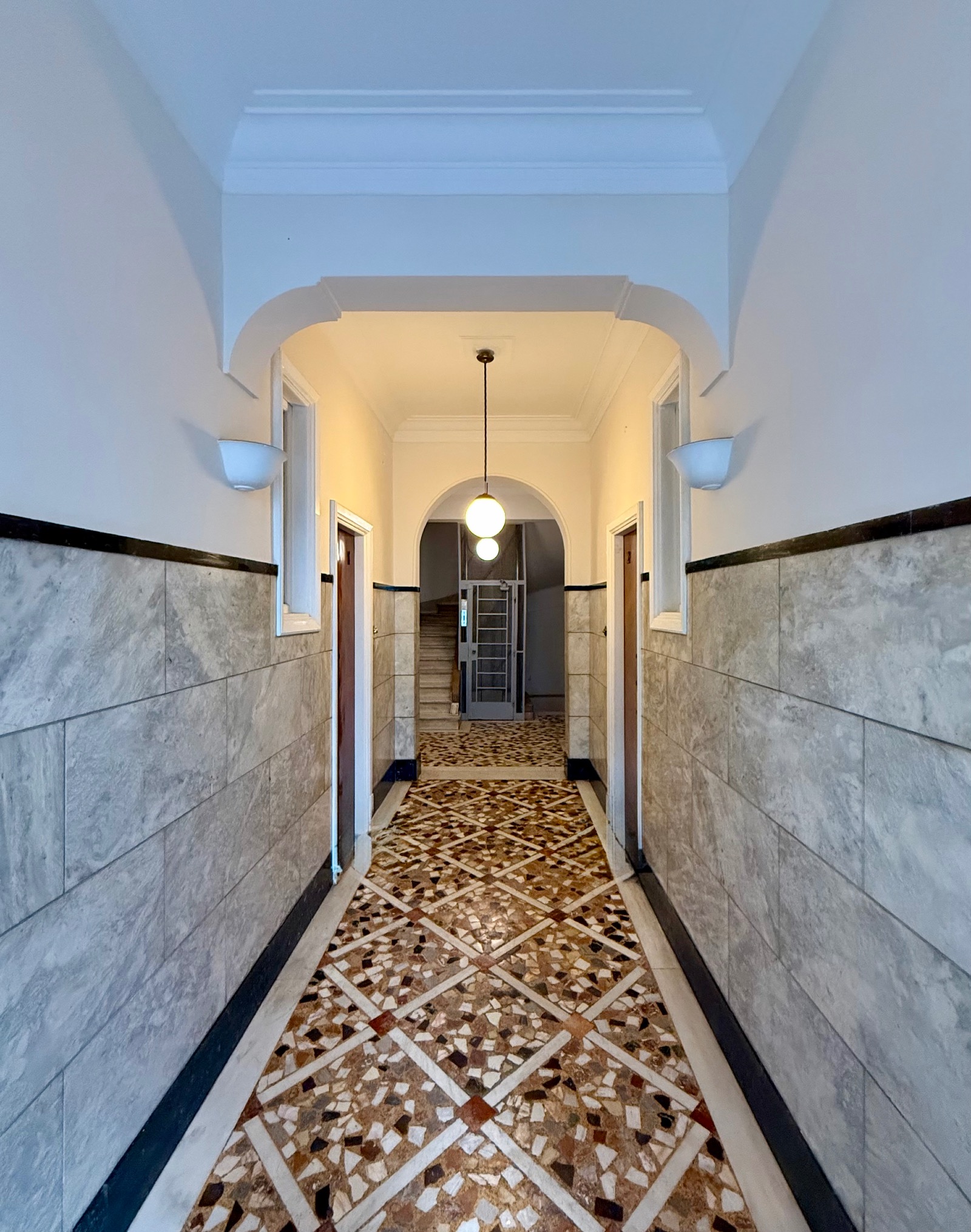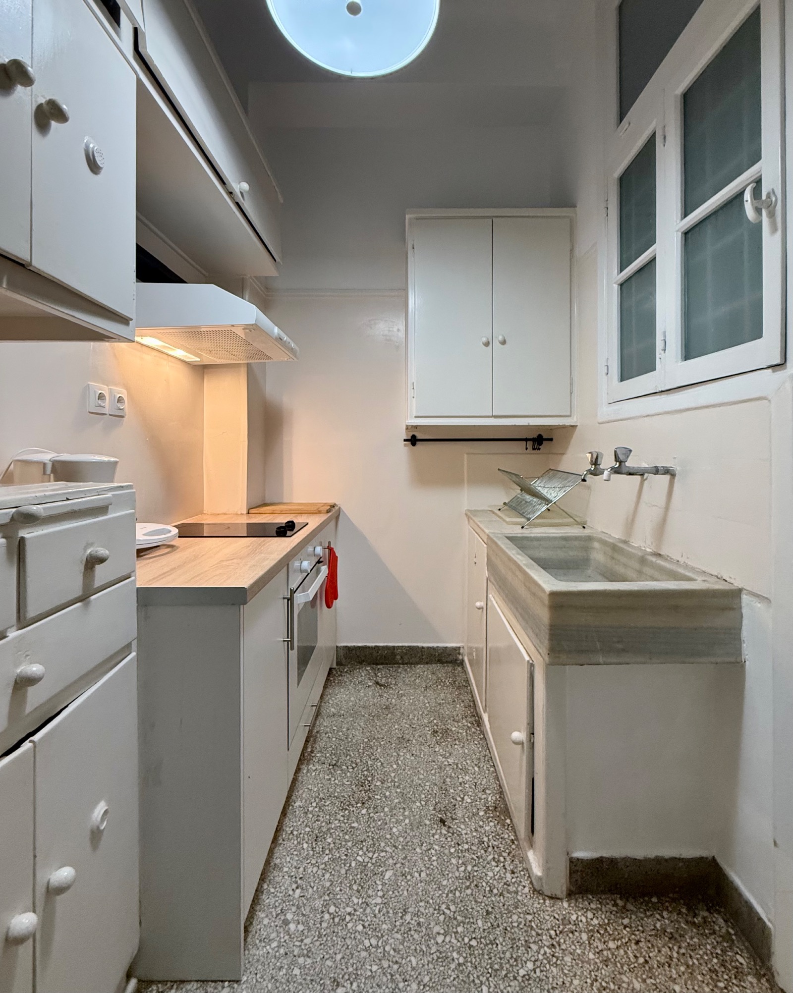 It is cross-ventilated with two rooms at the back looking to a small uncovered area. In front a voluminous living area in two parts unfolds along a narrow balcony. Between the entrance and the reception areas a hall is leading to the kitchen and a storage room. Ceiling is high and bright wooden floors mix with mosaic in harmony with the "retro" character. Most of the original materials have been very well maintained and various upgrades have been made such as double-glazed windows and two A/C units in the bedrooms.