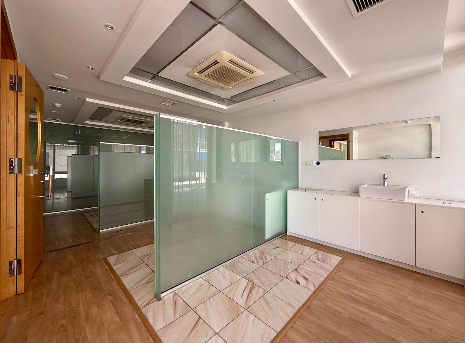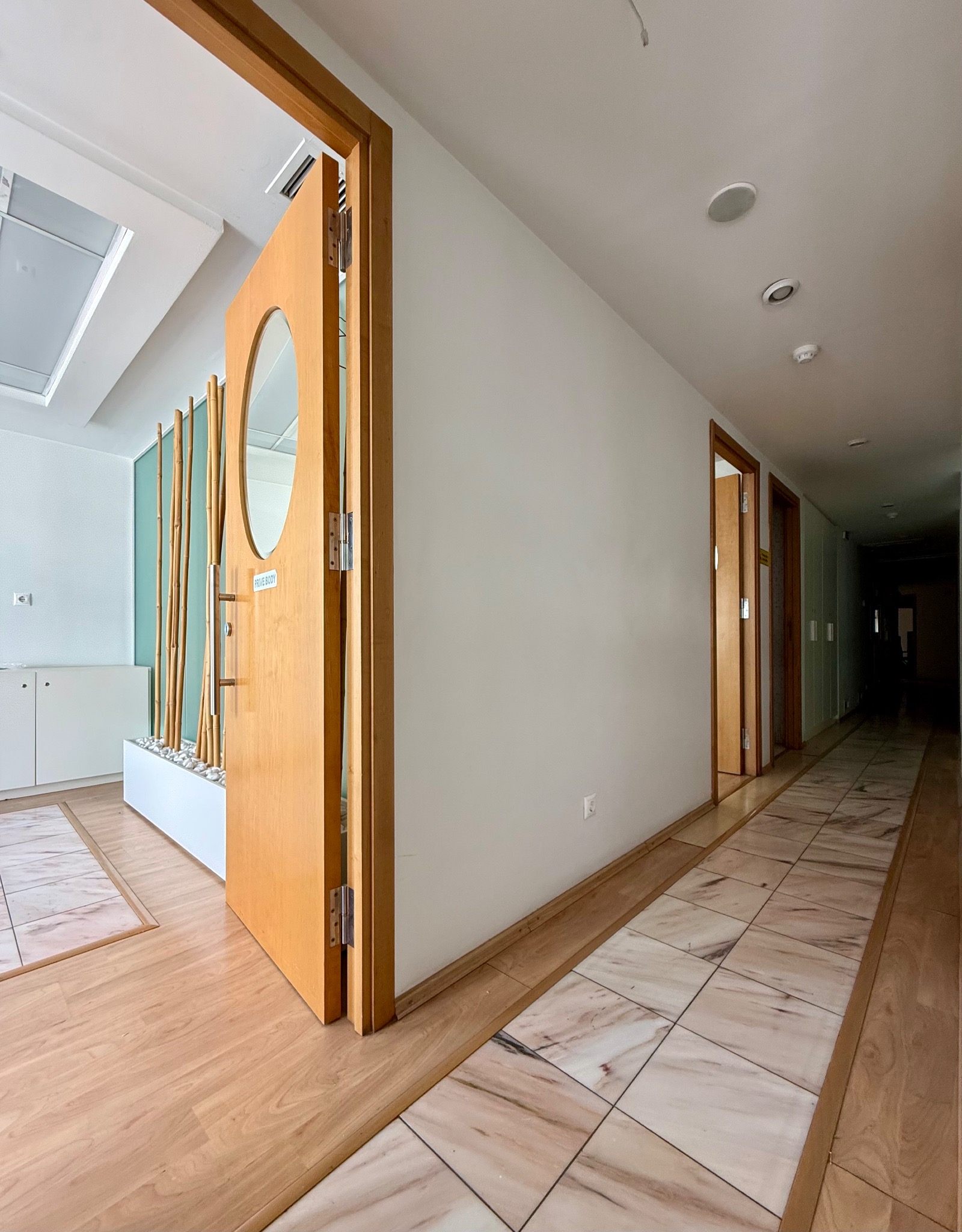 It covers the entire 5th floor of an office building from the 70's that has been recently fully renovated. Consisting of many small rooms with removable separations the lay-out is rather adaptable to different uses.